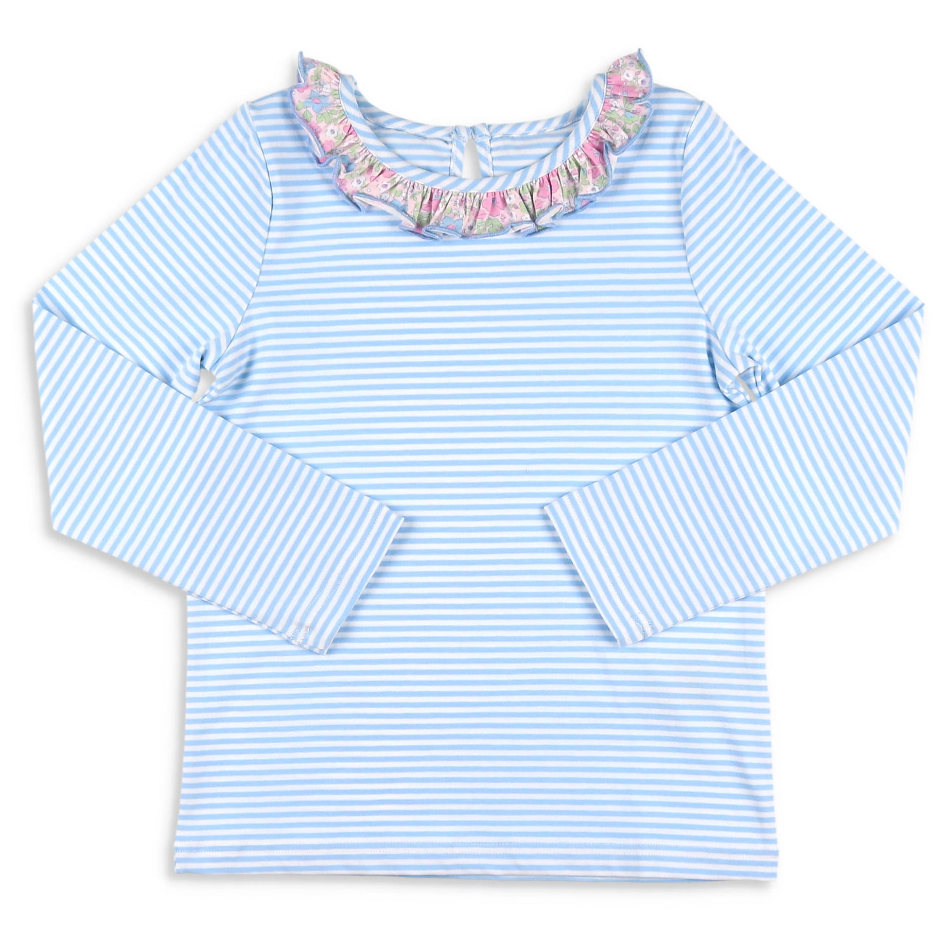This feminine top, features a soft fabric in blue and white stripe, a diagonal striped trimmed neckline and keyhole back, long sleeves, and a floral ruffle collar. Pair with our Girls Scallop Leggings-Blushing Blooms for a truly adorable outfit.