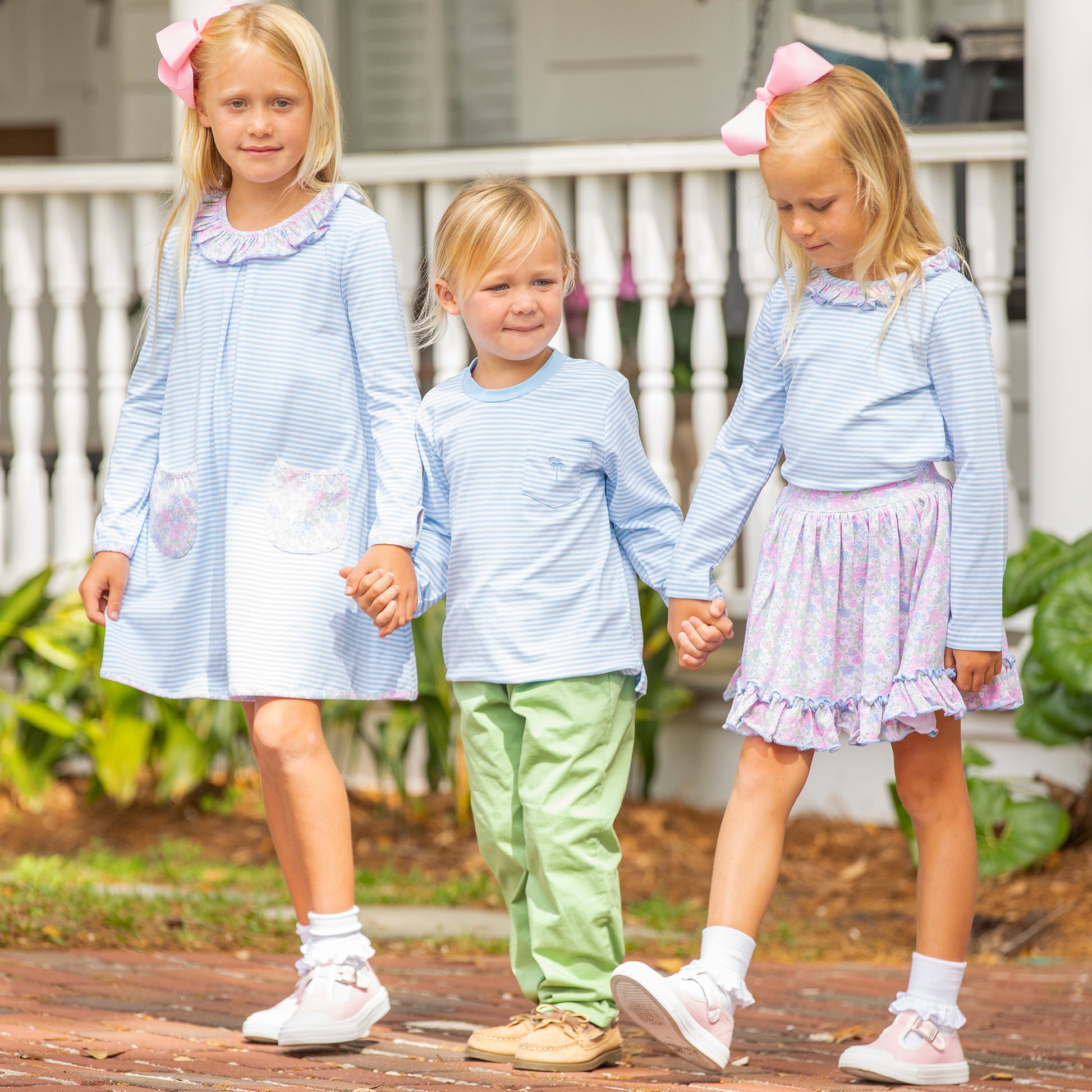 Perfect for fun Fall and Winter activities, even Christmas parties and activities. And with our Blushing Blooms, and Blue Stripe collections, she can have coordinating sibling outfits!