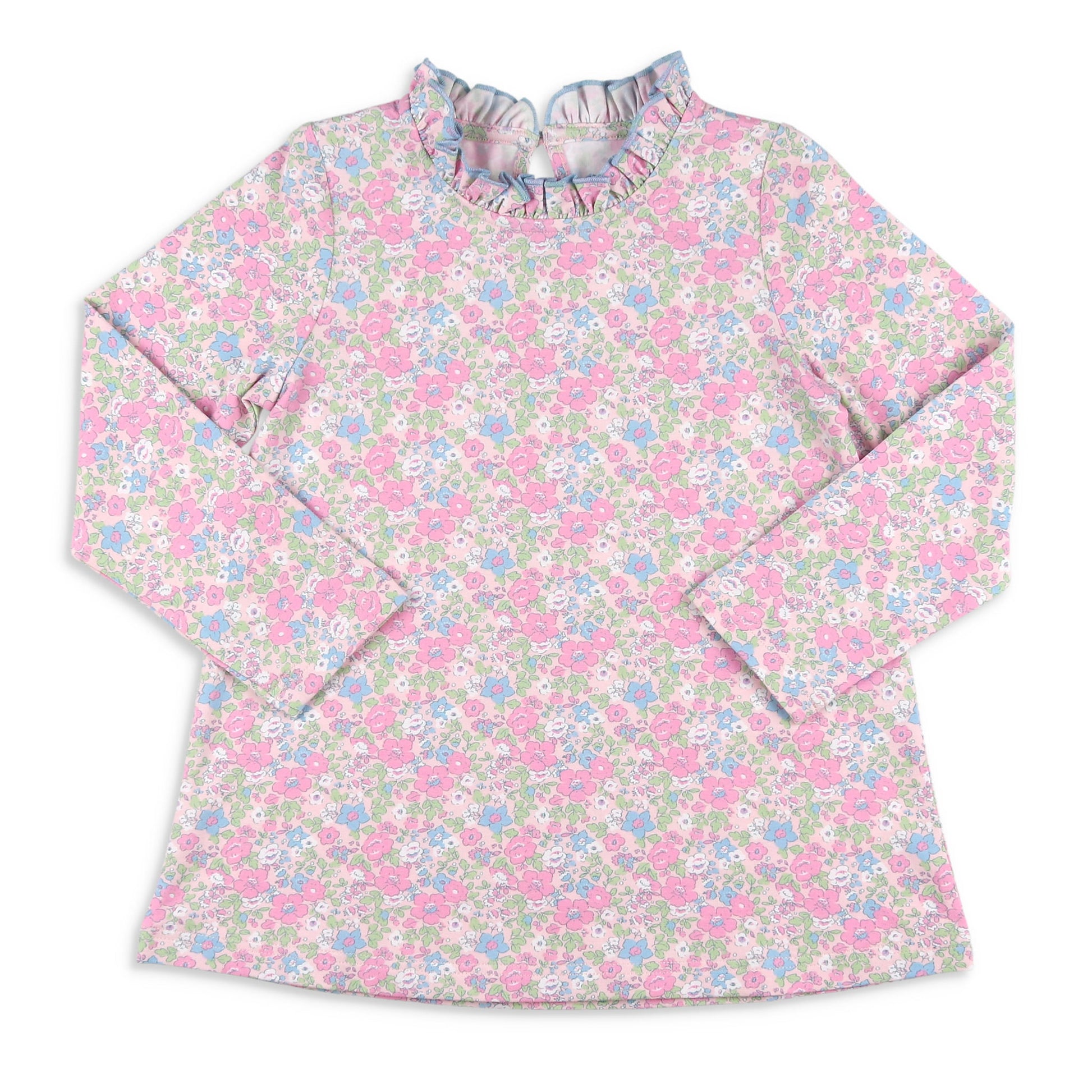 What girl isn't in love with pastel flowers, especially in pinks and blues? And this whimsical and adorable Girls Ruffle Neck Top-Blushing Blooms by Serendipity is destined to become her favorite!