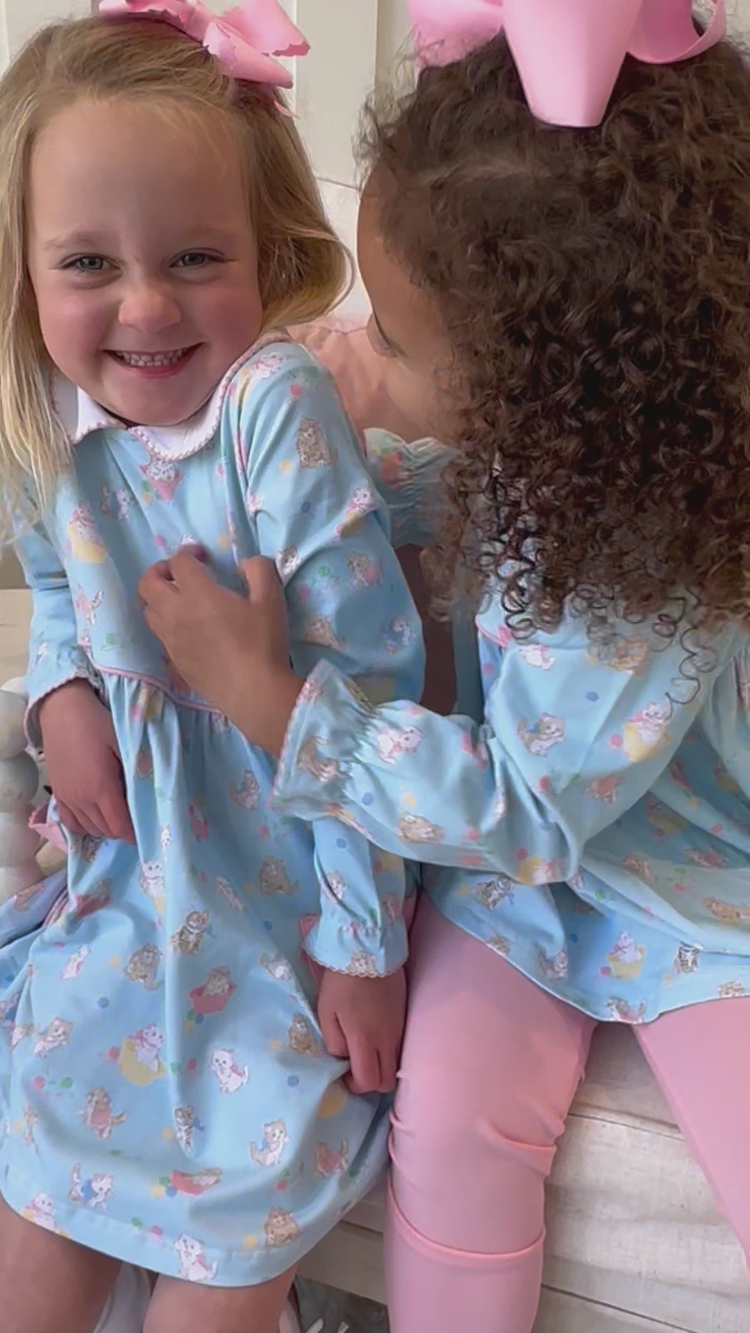 This whimsical dress features soft, cotton knit fabric in a playful kitten print on light blue with a sweet pink picot trimmed white collar, long ruffle sleeves, and picot trimmed pink front pockets, along with pink piping across the chest, all creating a darling picture! The fun keyhole back, makes this dress even more special.