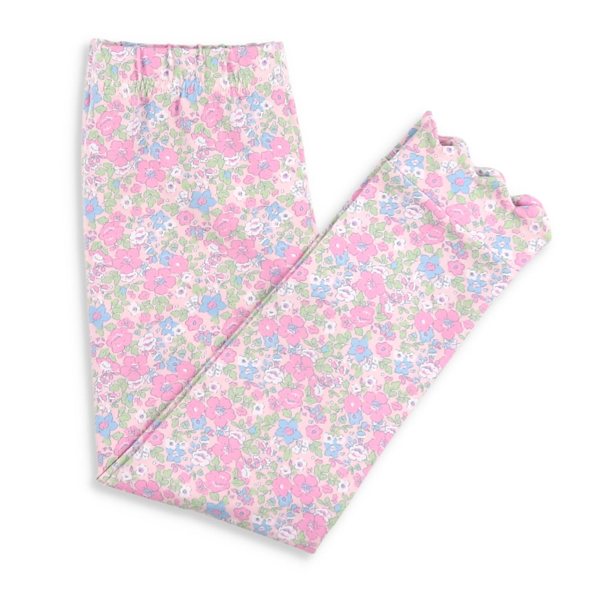 These easy-to-wear, comfortable elastic waist leggings, feature soft, cotton knit fabric in a pink, white, and blue floral with scalloped hem legs. So sweet and feminine!