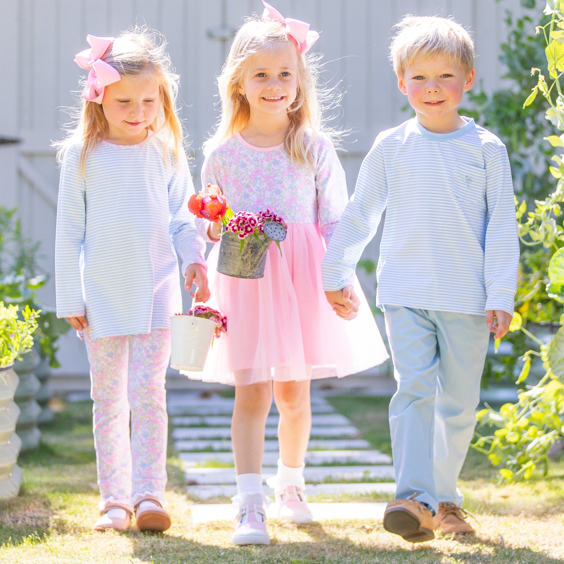 Pair with one of our Girls Ruffle Neck Tops or her favorite sweater. Perfect for school and all winter activities, especially celebrations! And with our matching Blushing Blooms collection and our Blue Stripe collection, what a perfect sibling photo opp these will make!
