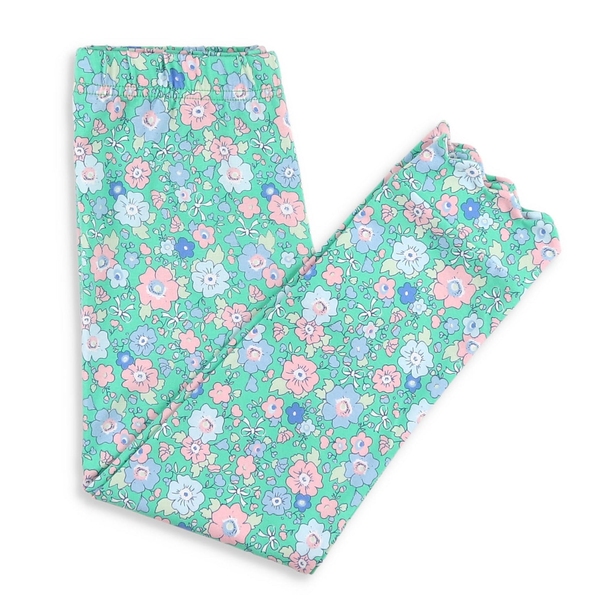 These feminine leggings, feature a soft fabric in blues, pink, and a white delicate floral print on green cotton knit, with a dainty scalloped hem and an easy elastic waist. Pair with our Girls Ballet Pink Ruffle Neck Top for an adorable look!