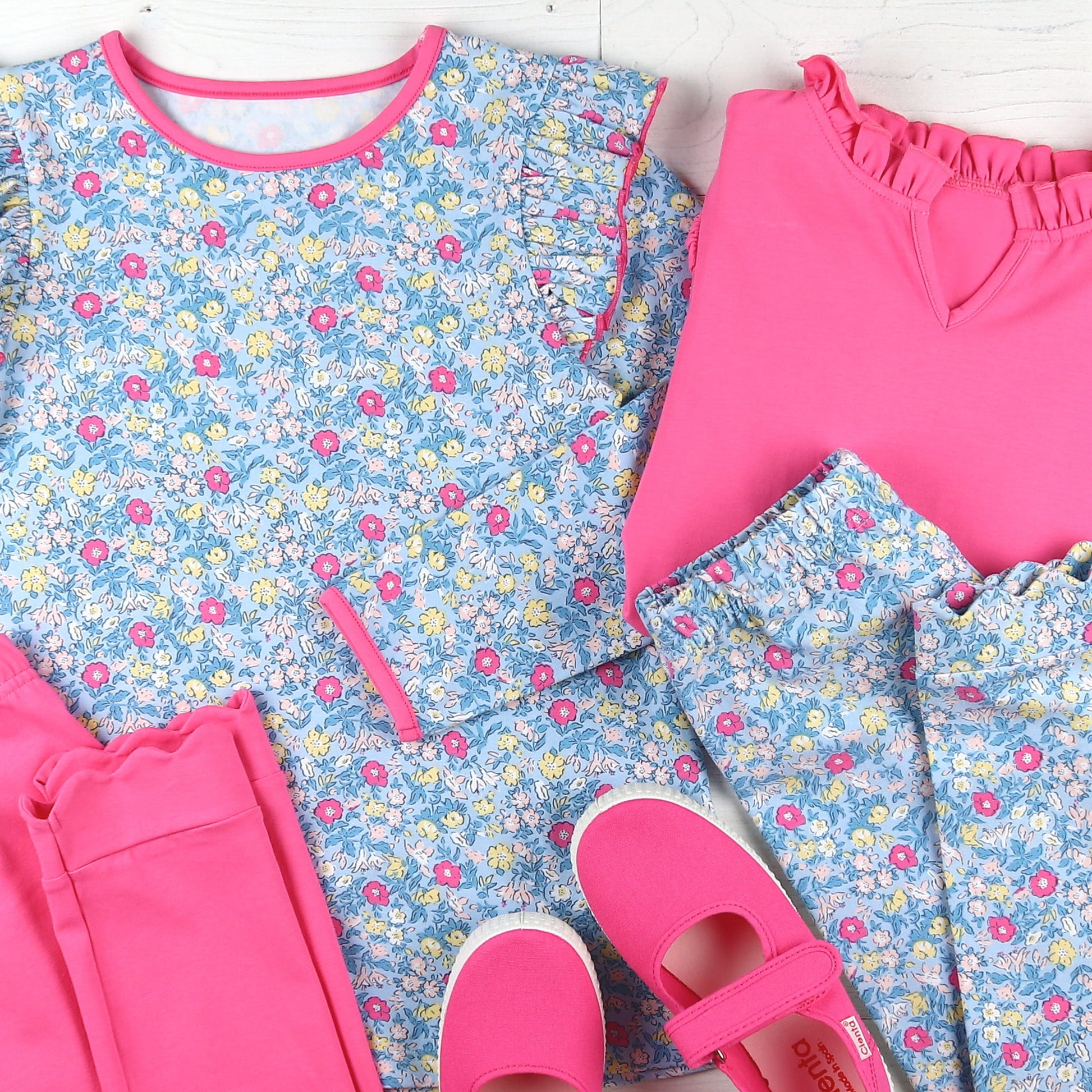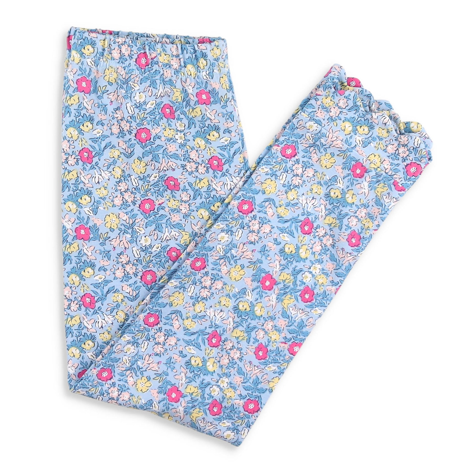 These playful pants feature soft, cotton knit fabric in a pink, blue, white, and yellow floral print on light blue, an elastic waist, and a scalloped hem at legs creating the most fun picture!ย Pairing them with our Girls Ruffle Neck Top-Razzelberry, just makes one special outfit.ย