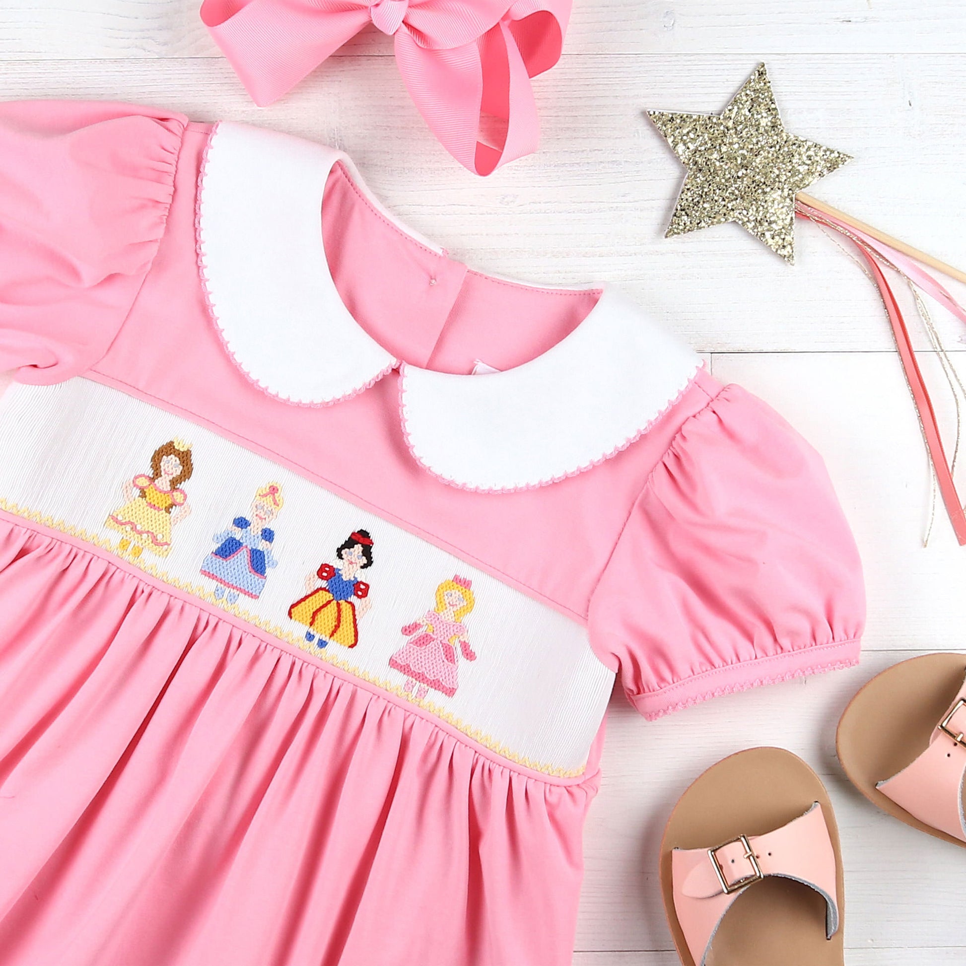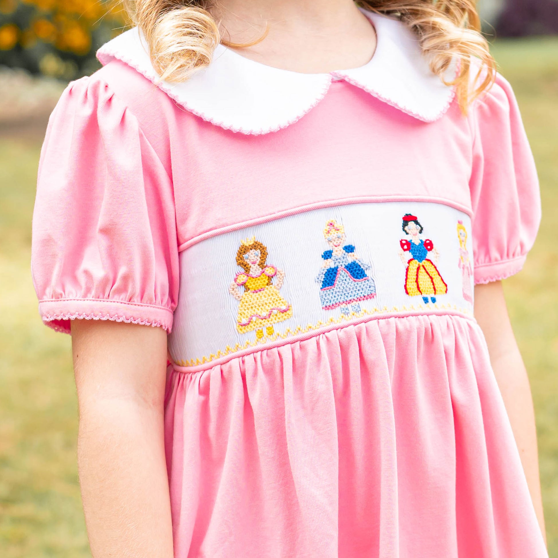 What girl doesn't love a good princess story?! And surely she will love this adorable and classic, short sleeved, custom hand smocked, Girls Smocked Dress - Princesses!
