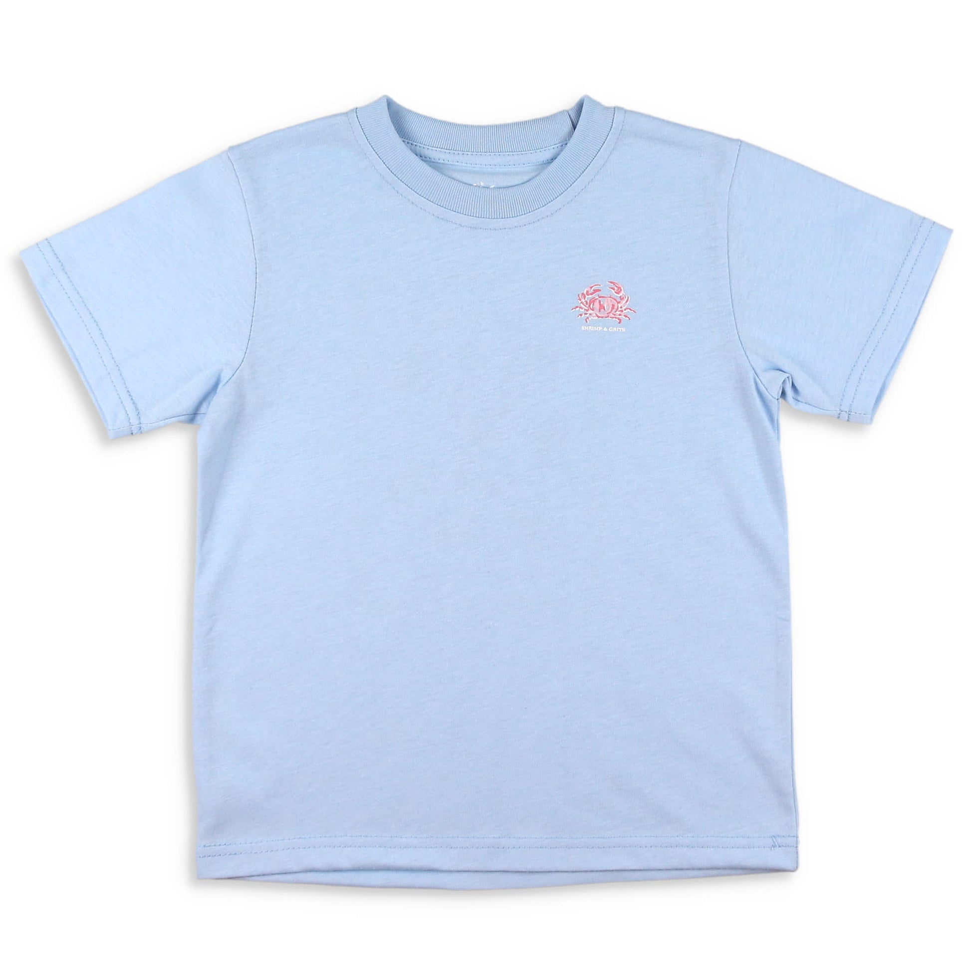 The Stay Salty girls graphic tee is a versatile light blue short-sleeve shirt featuring a colorful back graphic with seashells, a lobster, a crab, and the phrase "STAY SALTY" along with "Shrimp and Grits." The front has a small lobster graphic on the left chest.
