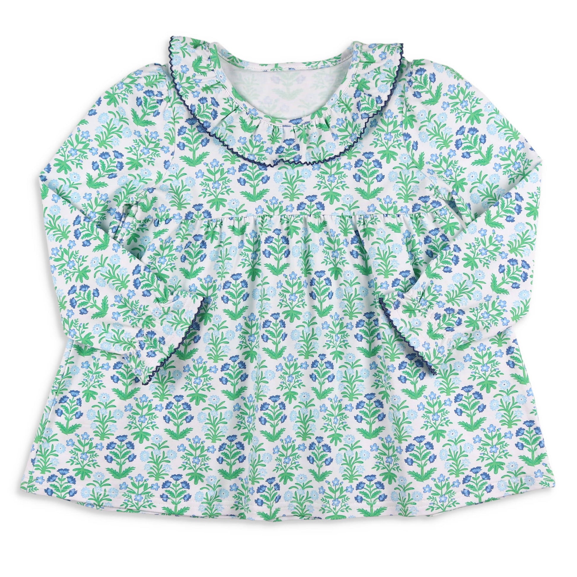 This sweetly feminine, classic style versatile top, in a cornflower blue and green floral print on soft white cotton blend fabric, with a navy picot trimmed ruffle collar, and ruffle sleeves for sizes XXS-M and a V neckline with banded sleeves for sizes L-14. Just a special vintage look. Pair with our Midnight Blue or other leggings for a fun outfit!