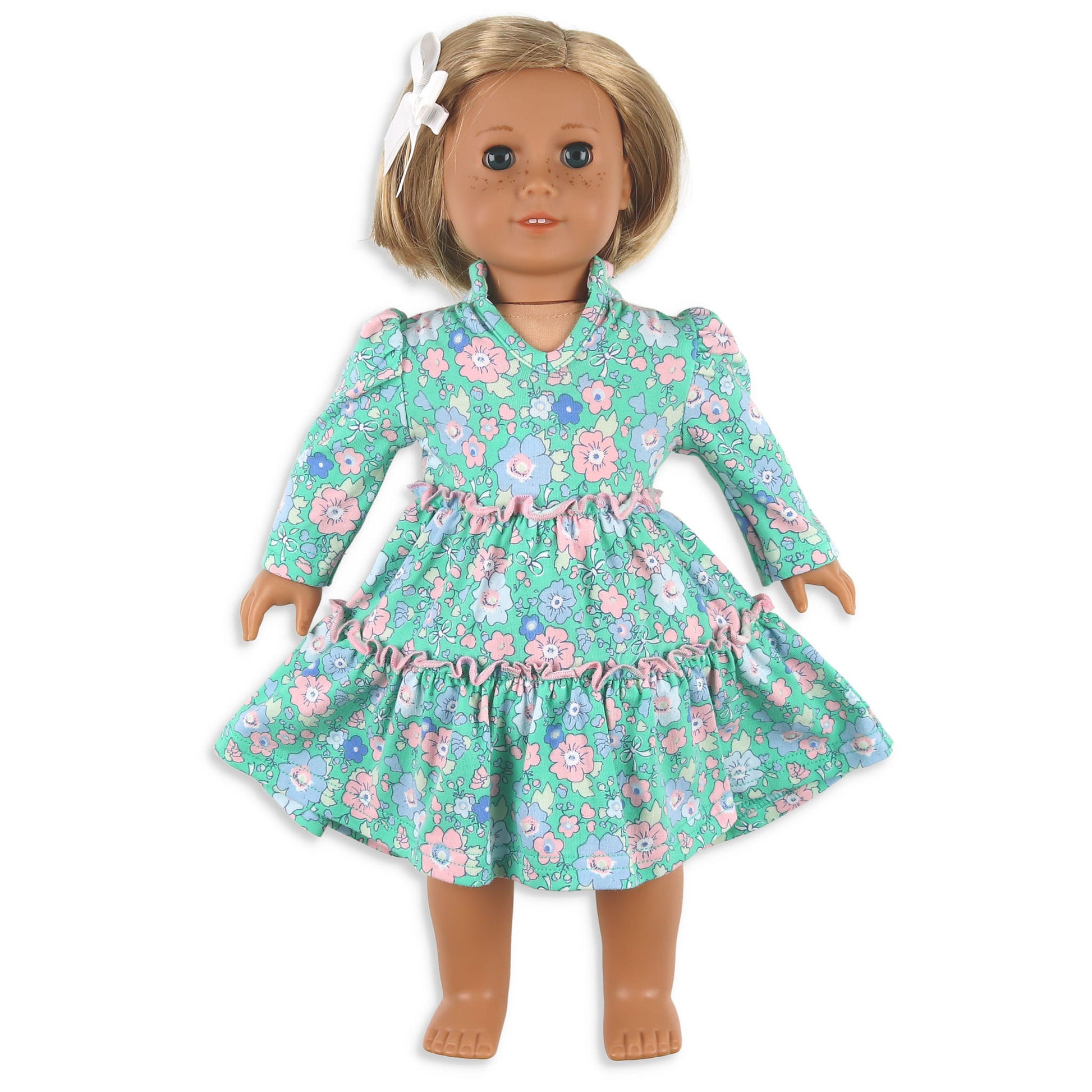 How excited will your daughter be to dress her favorite doll in outfits that match hers? So many of the adorable Serendipity collections have matching doll outfits. The Girls Twirl Doll Dress-Garden Green comes in a happy floral print on a green background, featuring a V neck collar, and pink serge ruffles. Look for the coordinating items on our site and watch the joy radiating on your daughter's face!!