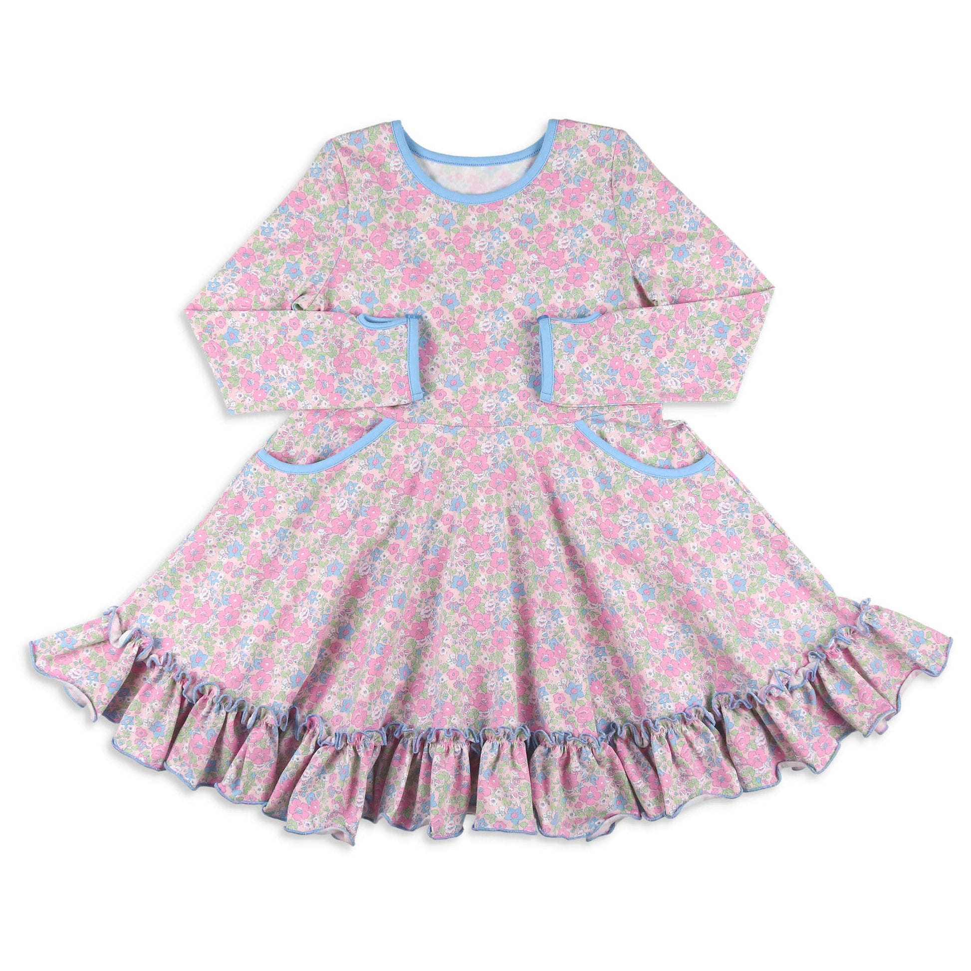 This easy-to-wear, comfortable dress, features soft, cotton knit fabric in a pink, white, and blue floral with a blue trimmed neckline, trimmed side pockets, trimmed long sleeves, and a full twirl skirt with an adorable ruffle at the skirt hem. The keyhole sleeves are an added favorite bonus! So sweet and feminine!