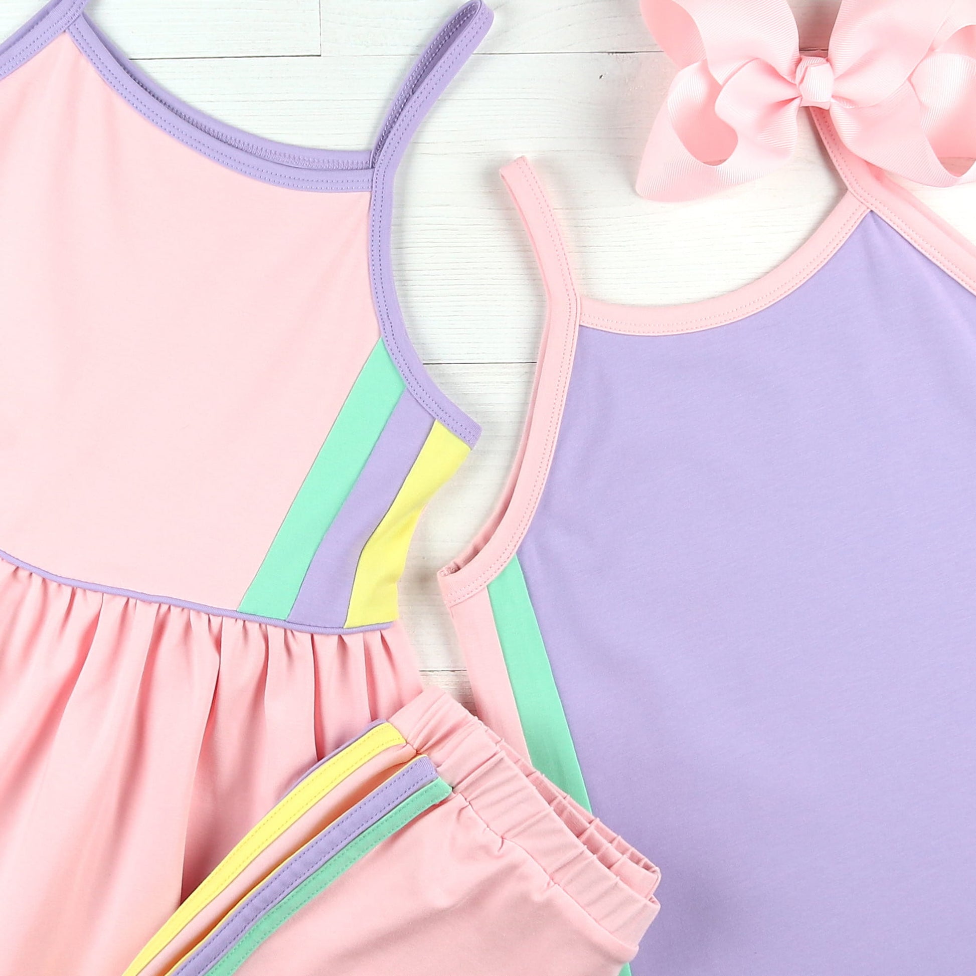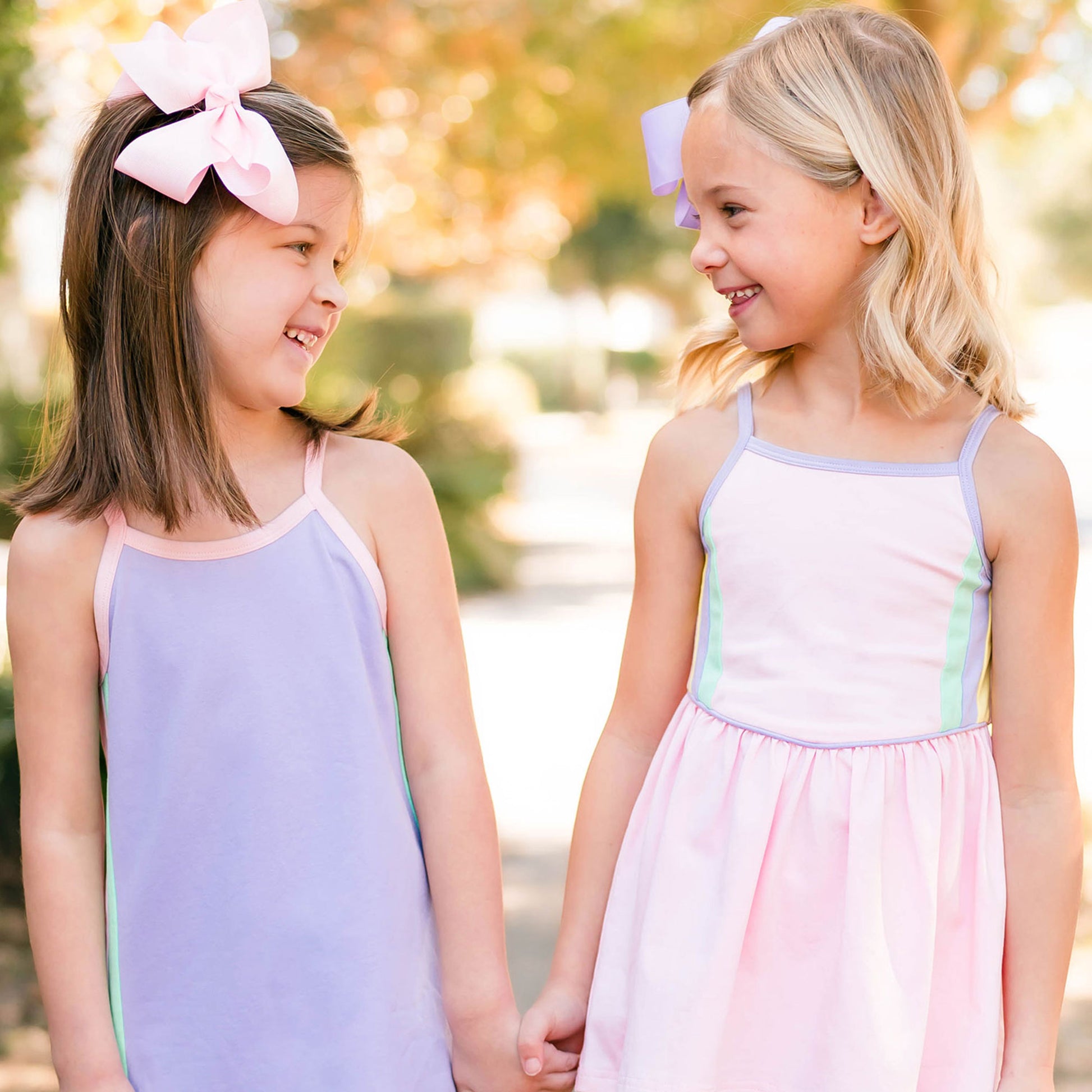 Introducing our new easy, comfy, and cute Girls Flowy Dress - Rainbow Brite by Shrimp and Grits Kids. With maximum comfort in mind, and fun princess lines, it features pink soft knit fabric, purple trim around the neckline, around the arms, and the waist, purple spaghetti straps, and aqua, purple, and yellow side panels. Such a fun vintage feel.