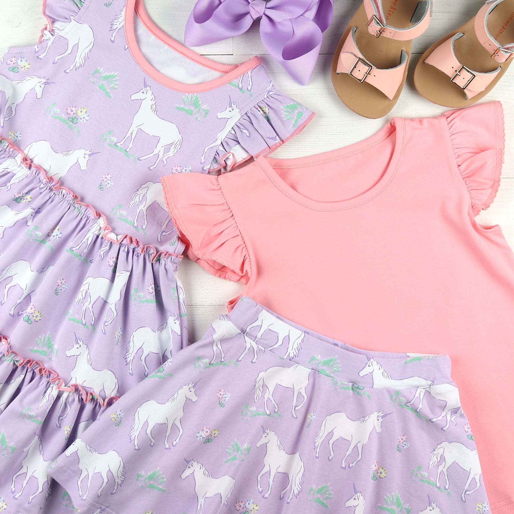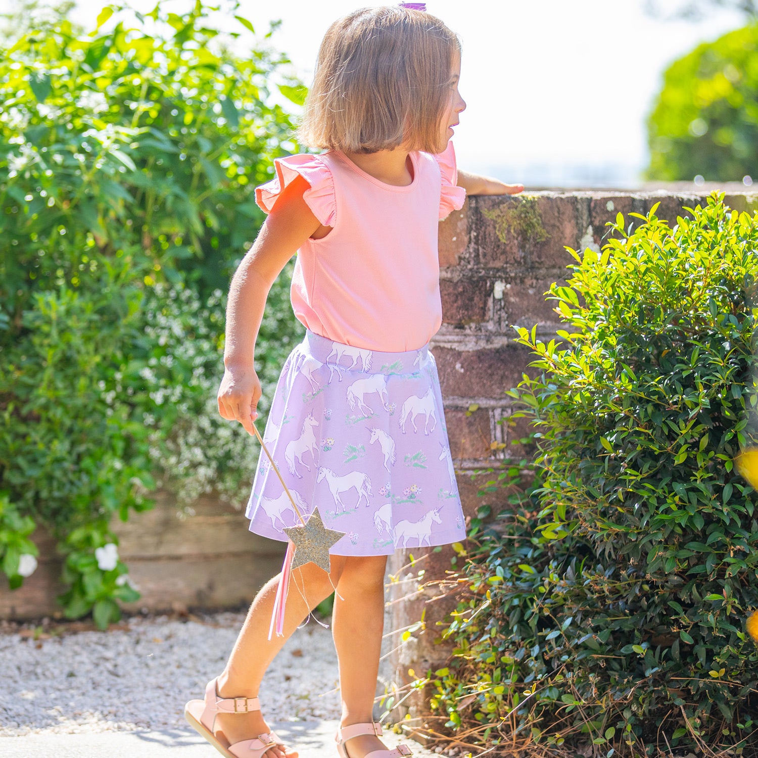 This whimsical skirt features soft, cotton knit fabric in a white unicorn print on lavender knit fabric, with an elastic waist and under skort pink pants for that added comfort, creating a darling picture! The full twirl skirt just make this skort even more special.