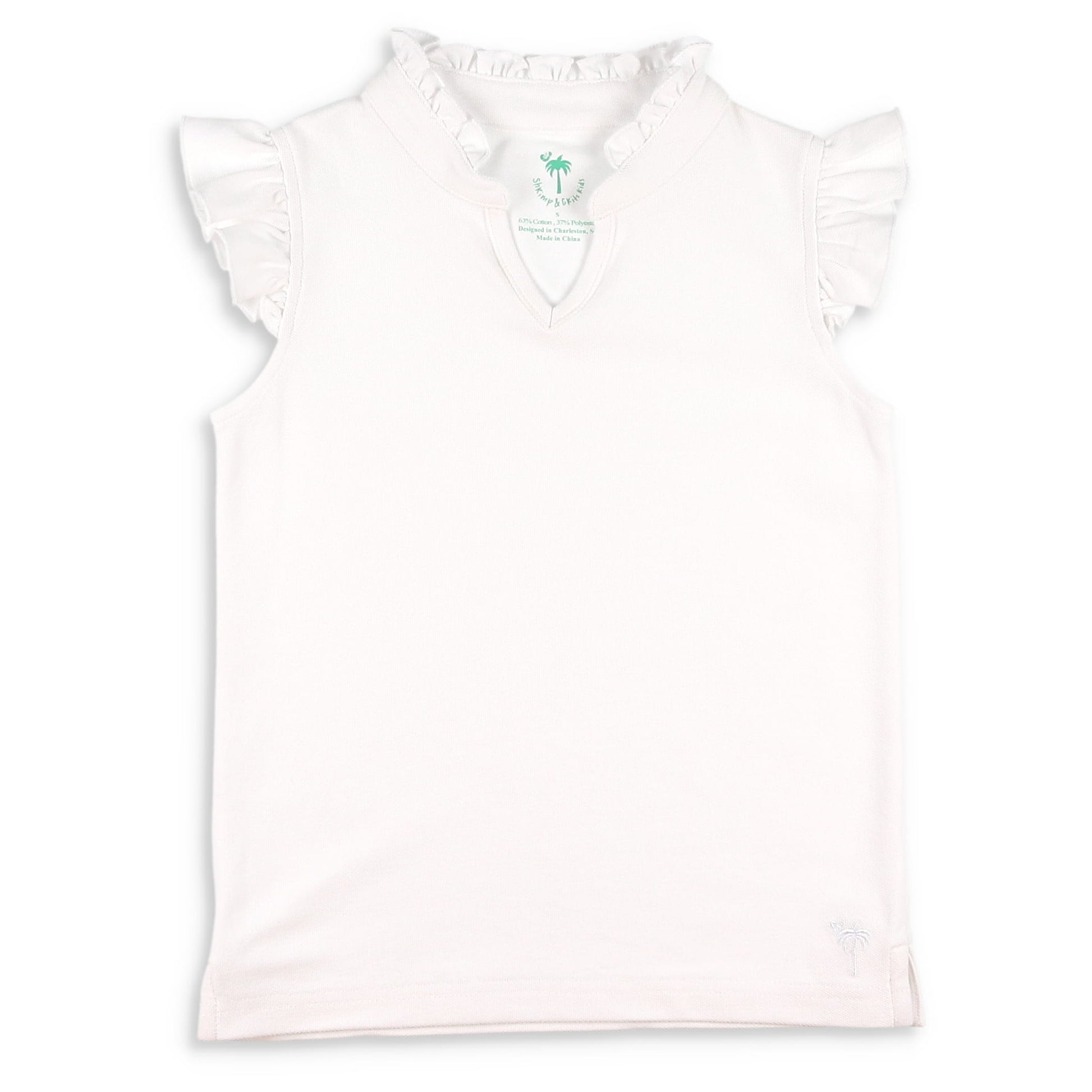 This versatile girls or toddler girls top features soft, cotton knit blend fabric in pure white, a ruffle collar, V neck front, and flutter sleeves making it perfect for pairing with shorts, skorts, skirts, or pants.