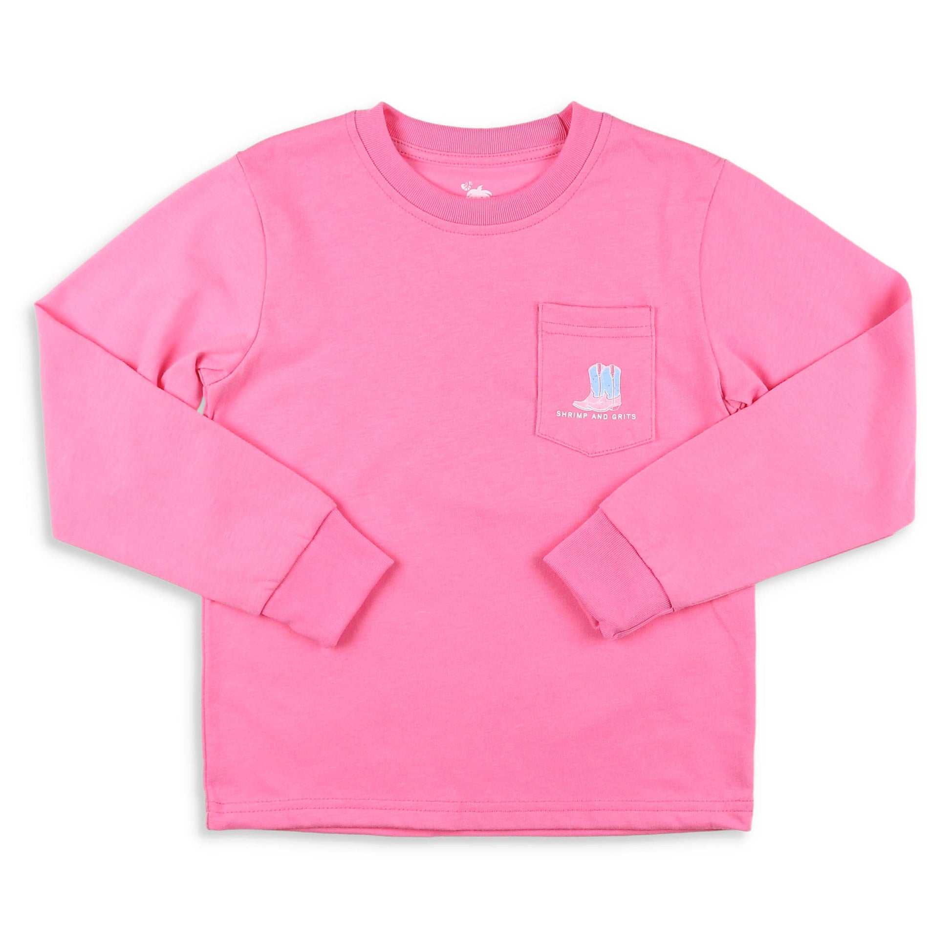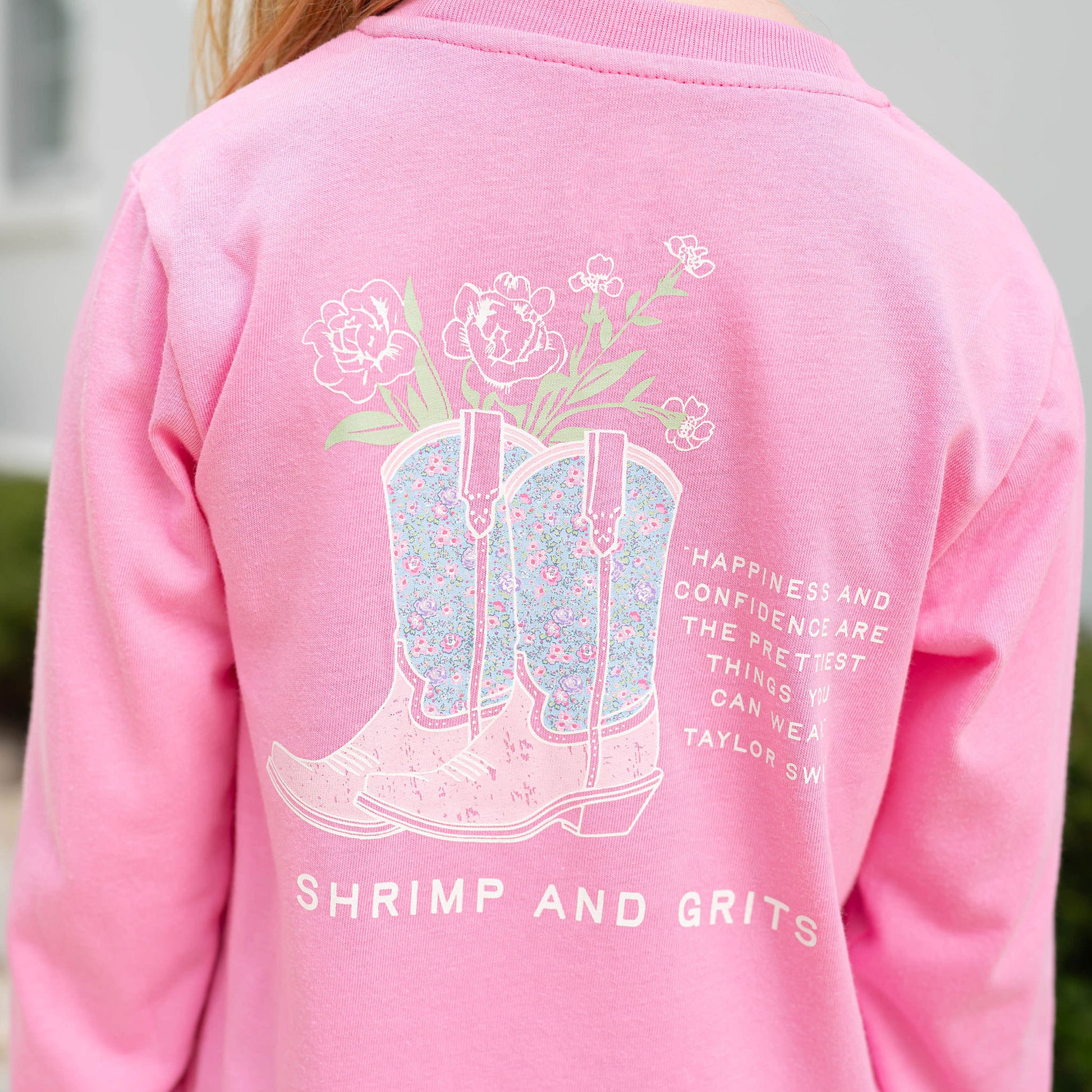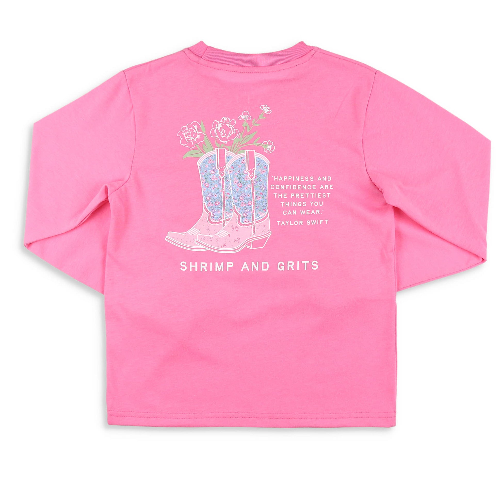 This girls Graphic Tee-Daisy Duke is casual, long sleeve, pink top and is perfect for any adventure. She'll look so ready for a trip to the country or a hoe down party. The banded neckline, front pocket with pink and blue cowboy boots and the words "Shrimp and Grits" in white, and larger graphic print of pink and blue floral cowboy boots with white flowers and a Taylor Swift quote on the back, makes it even more special!