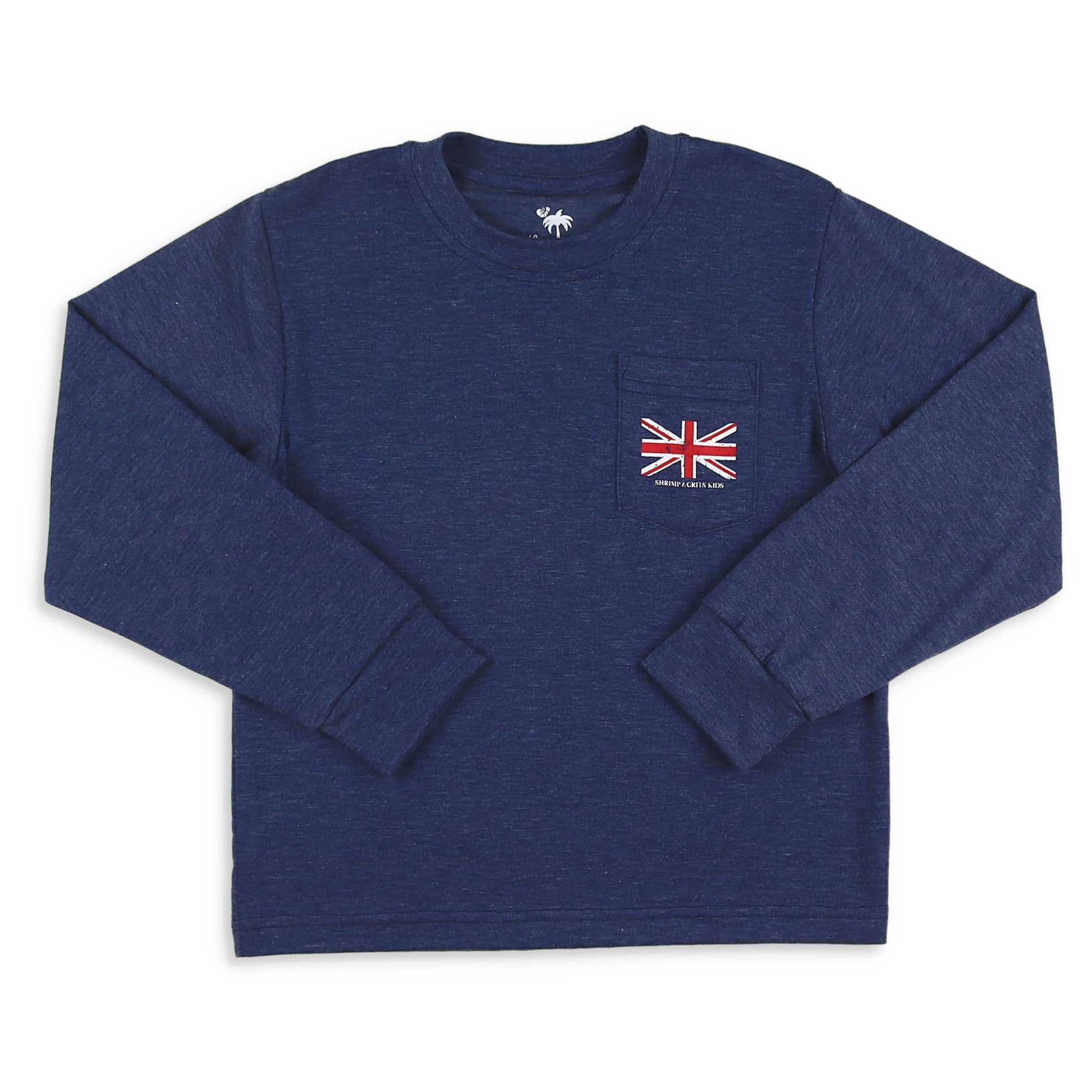 This heathered midnight navy blue, long sleeved Tee features a custom graphic double-decker bus in red on its back and a graphic British flag on the front pocket. It is so versatile and can mix and match with his wardrobe. Can pair with our Red Knit Shimp Pants or our Red Corduroys or Overalls. Perfect for a fall or winter day of play!! And with our London Calling collection, he can have coordinating sibling outfits!