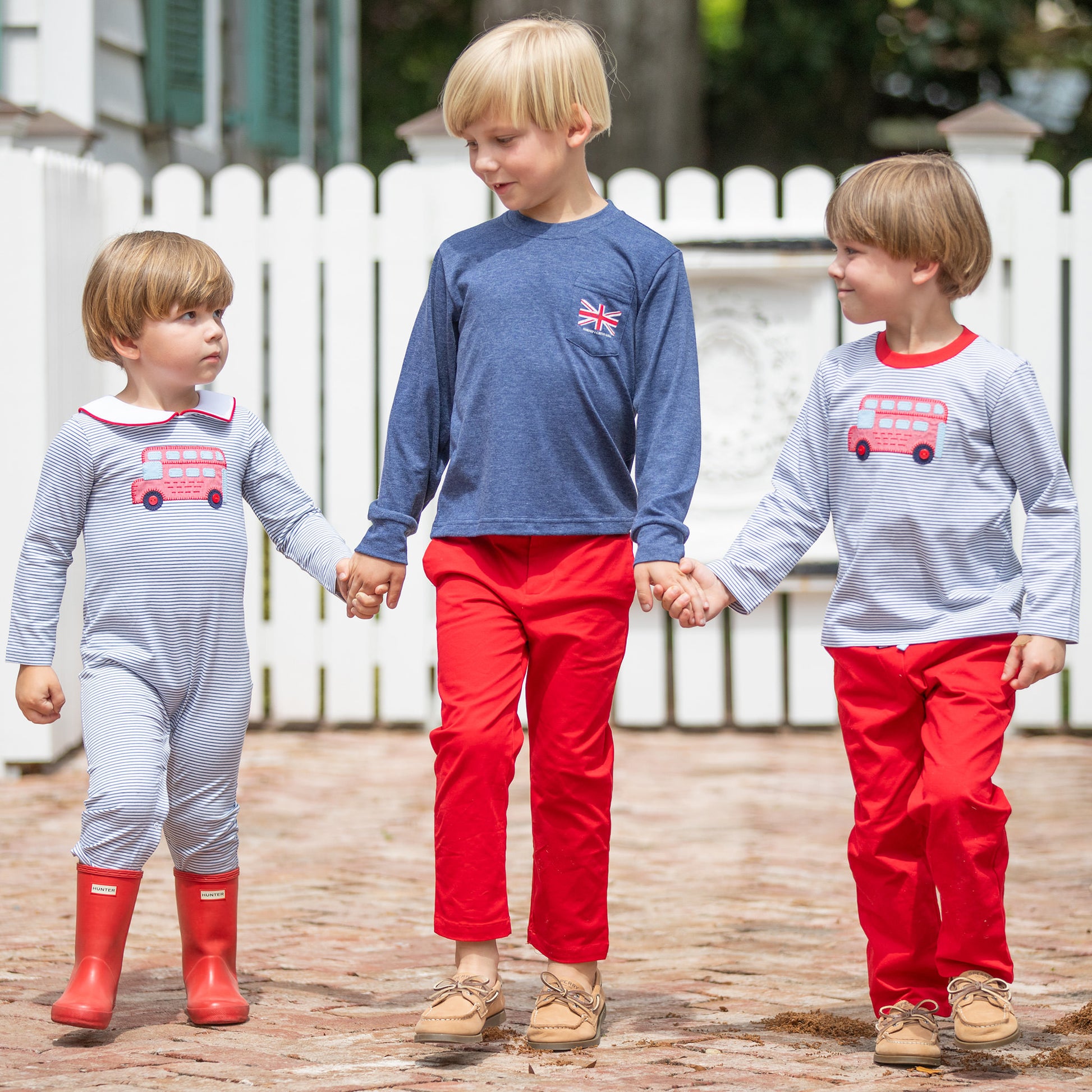 Double-decker buses became popular in England at the beginning of the 20th Century and the most popular one is the Red London Bus. If London is one of your favorite cities, you'll love our festive London Calling Pocket Graphic Tee by Shrimp and Grits Kids! Your boys can enjoy wearing this fun bus while staying totally comfy in this new tee.