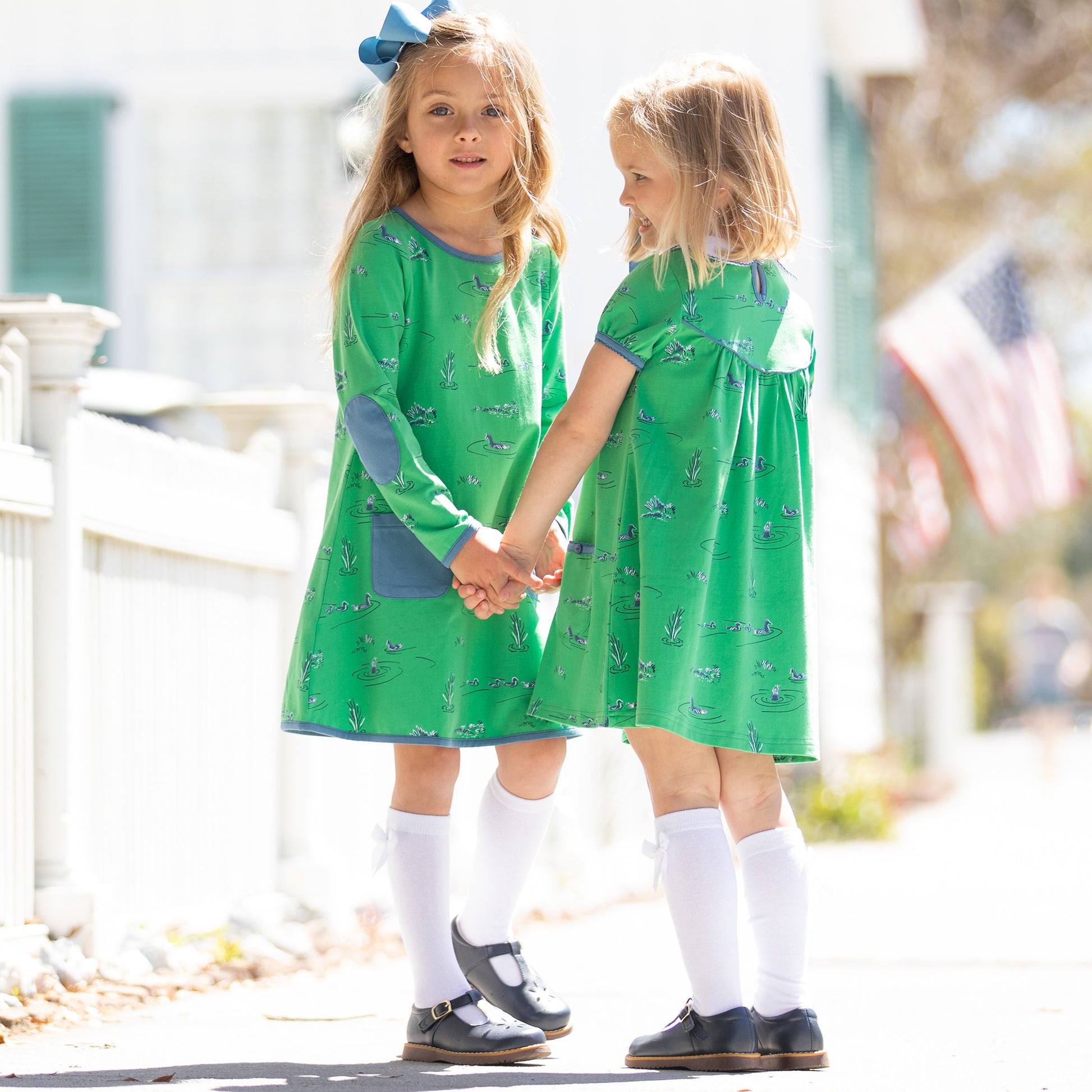 In a flying blue mallard print, on deep green soft, cotton knit fabric, this dress is a classic, easy-to-wear style for girls and features coordinating rich blue trim on the neckline, at sleeves and on the hem, and sweet blue front pockets. The blue elbow patches, make this dress even more special.