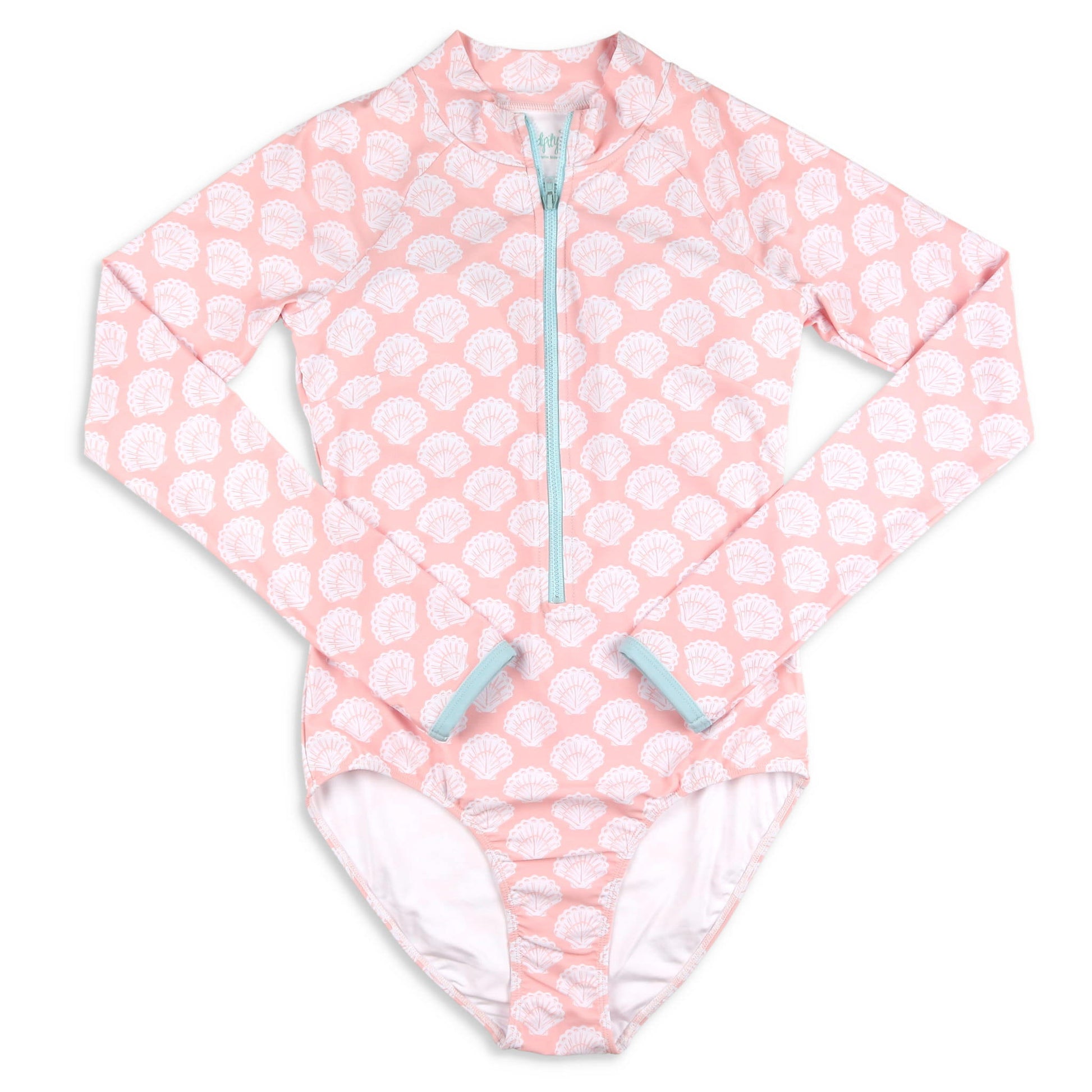 A favorite beach pastime is collecting and displaying the beautiful sea shells found there. What a sweet one piece addition to your beach wardrobe and it's perfect for pool and ocean fun all spring and summer long, keeping you safer from the hot sunshine!  With our Marion Bikini and our Mae One Piece Rash Guard suit, our Hugh Men's Boardshort, and our Hughey Boardies you can have matching swimwear with your entire family for the next beach vacation!!Â