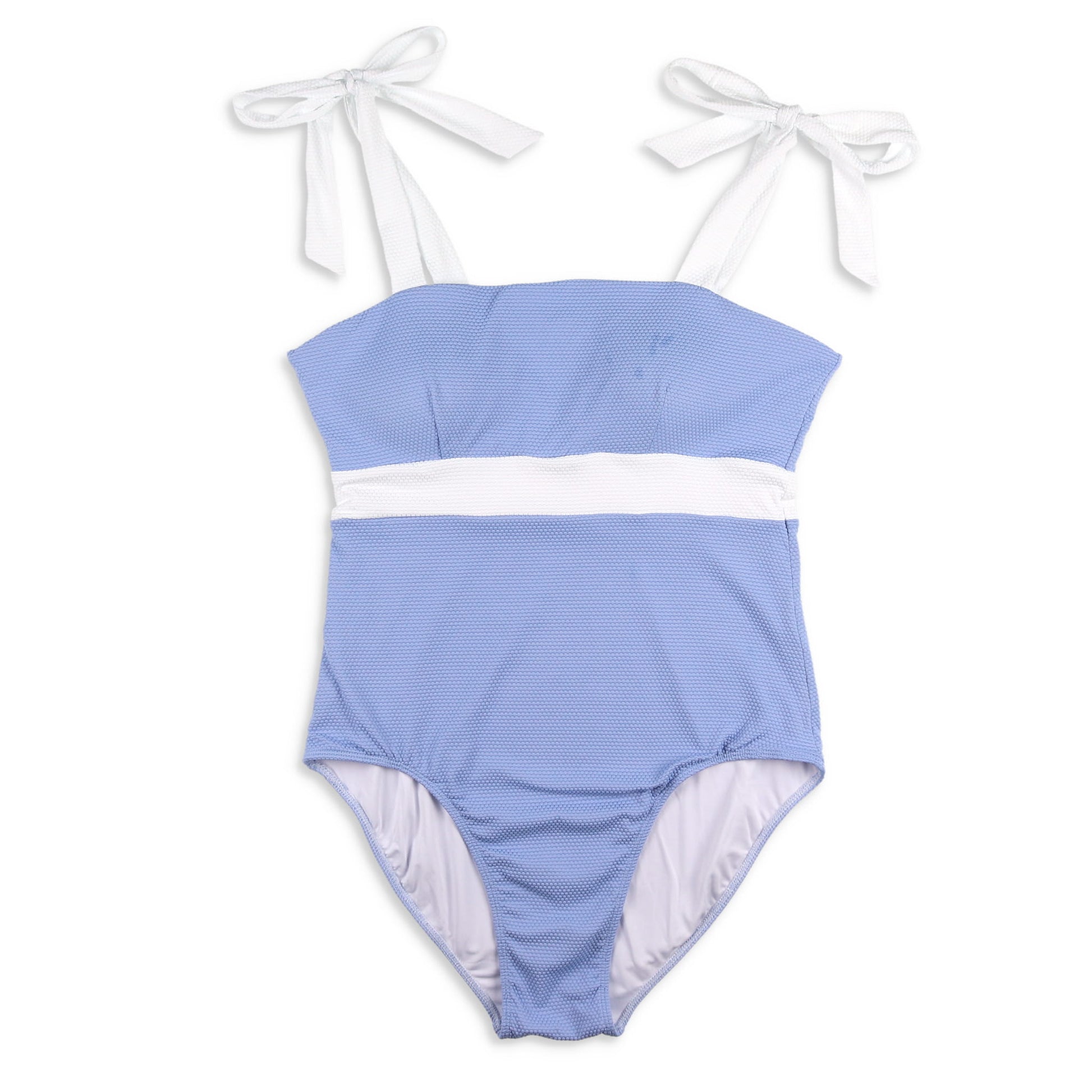 There's nothing so beautiful as the blue waters of our oceans. And this awesome, coastal bathing suit sets the seafaring tone! Grab the sunscreen and sunglasses! Flattering and classic describe this Blue Waters Colorblock Womens Suit by Serendipity! With the nautical, ocean blue textured fabric, the white tie shoulder straps, the slimming white stripe below the bodice, and the removable bra cups, this suit is as functional as it is cute.