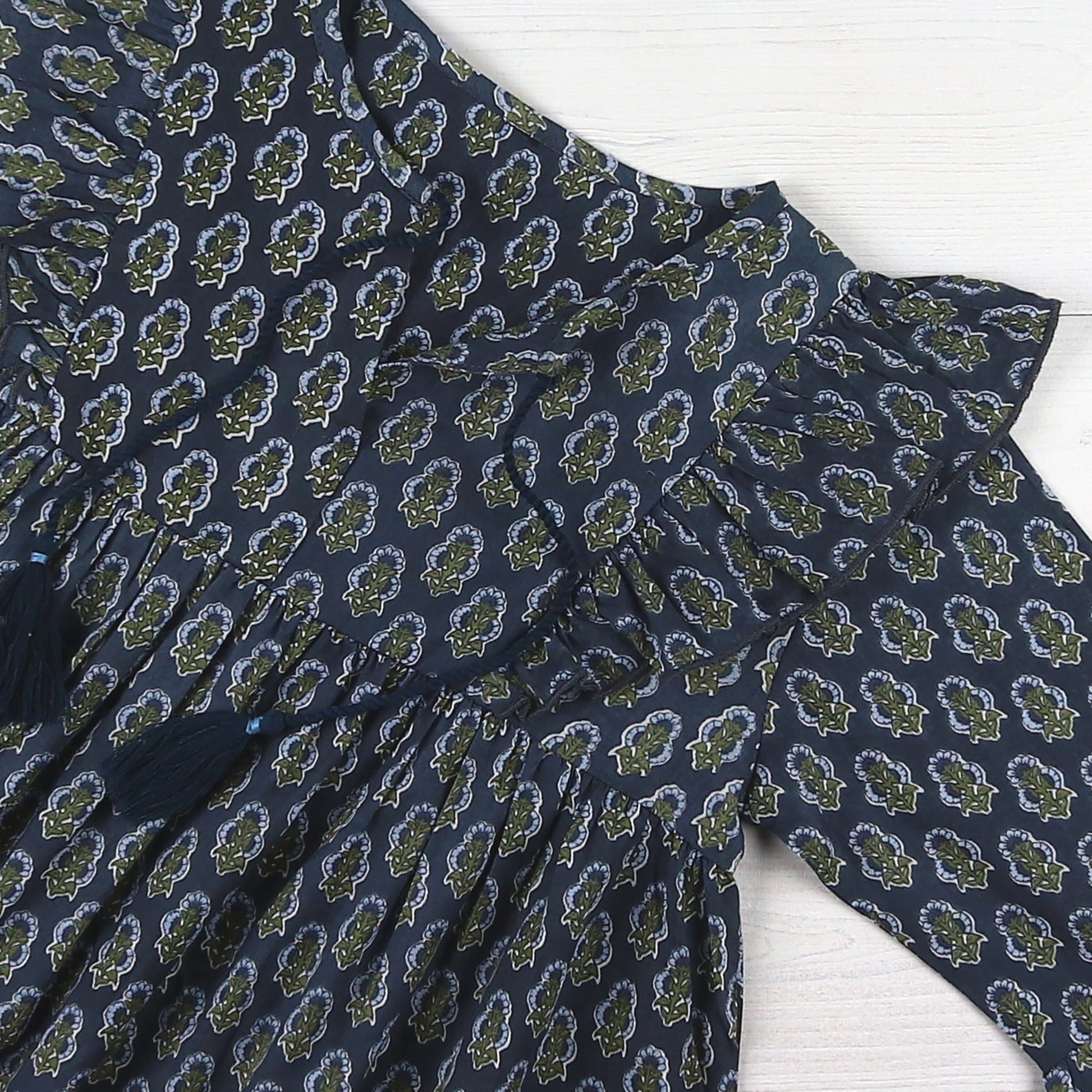 This fully lined and super comfortable bohemian inspired dress features a navy and green floral block print on 100% cotton fabric, 3/4 flounce ruffle sleeves, flutter shoulder details, and navy serge trim detail and tassel ties at neck. She'll want to own it in all the colors!