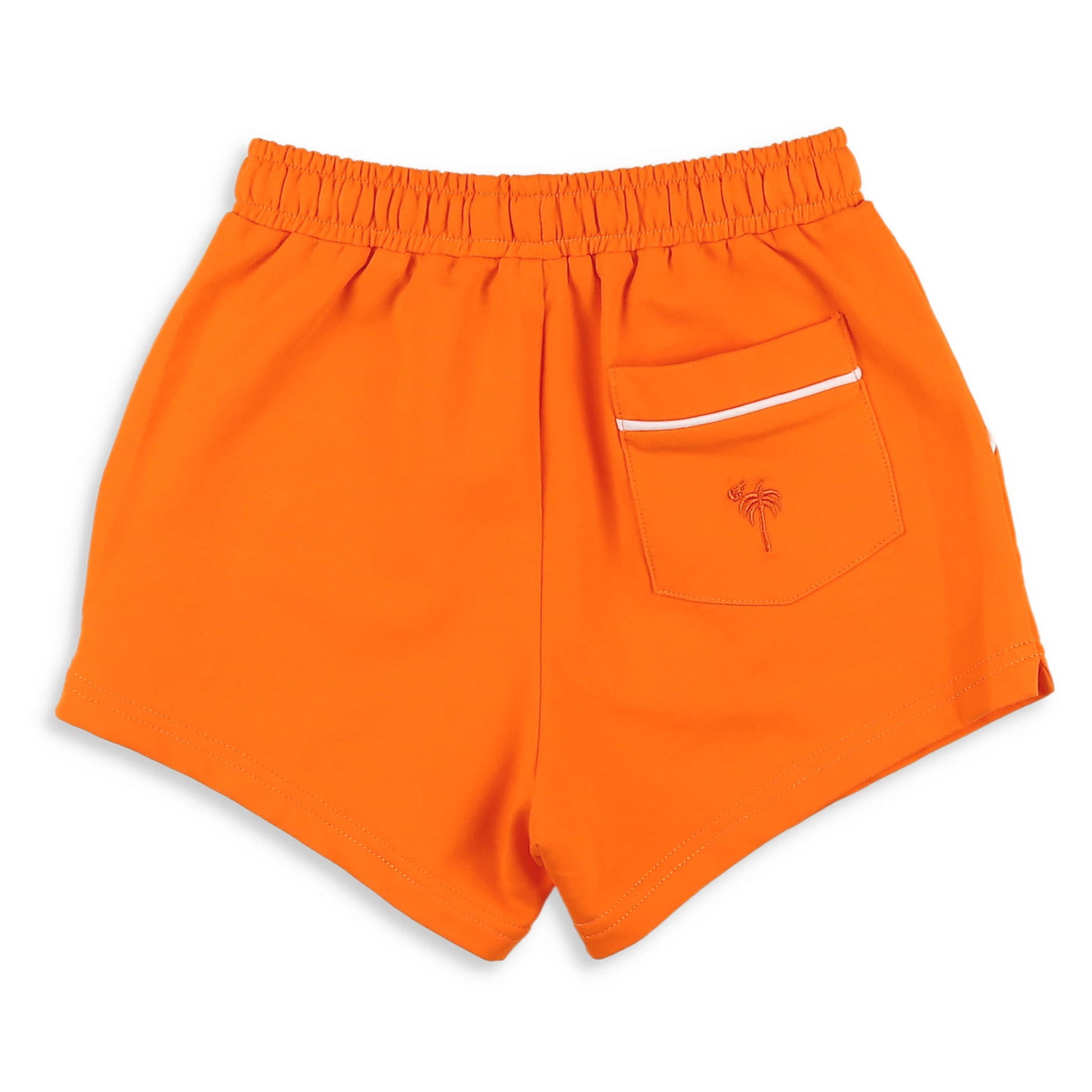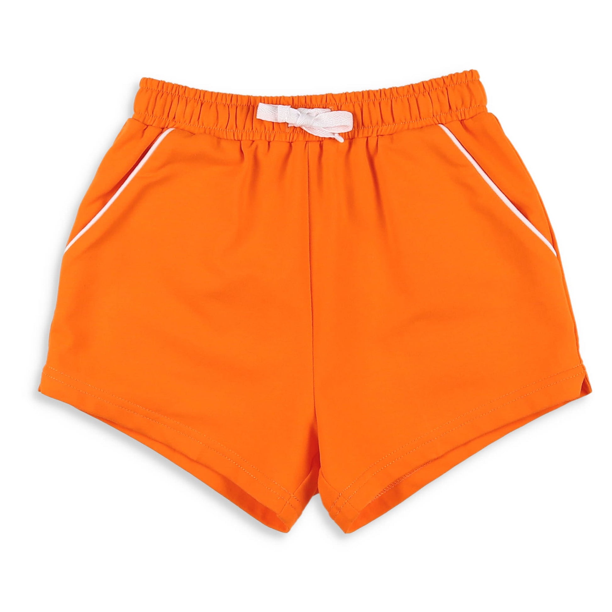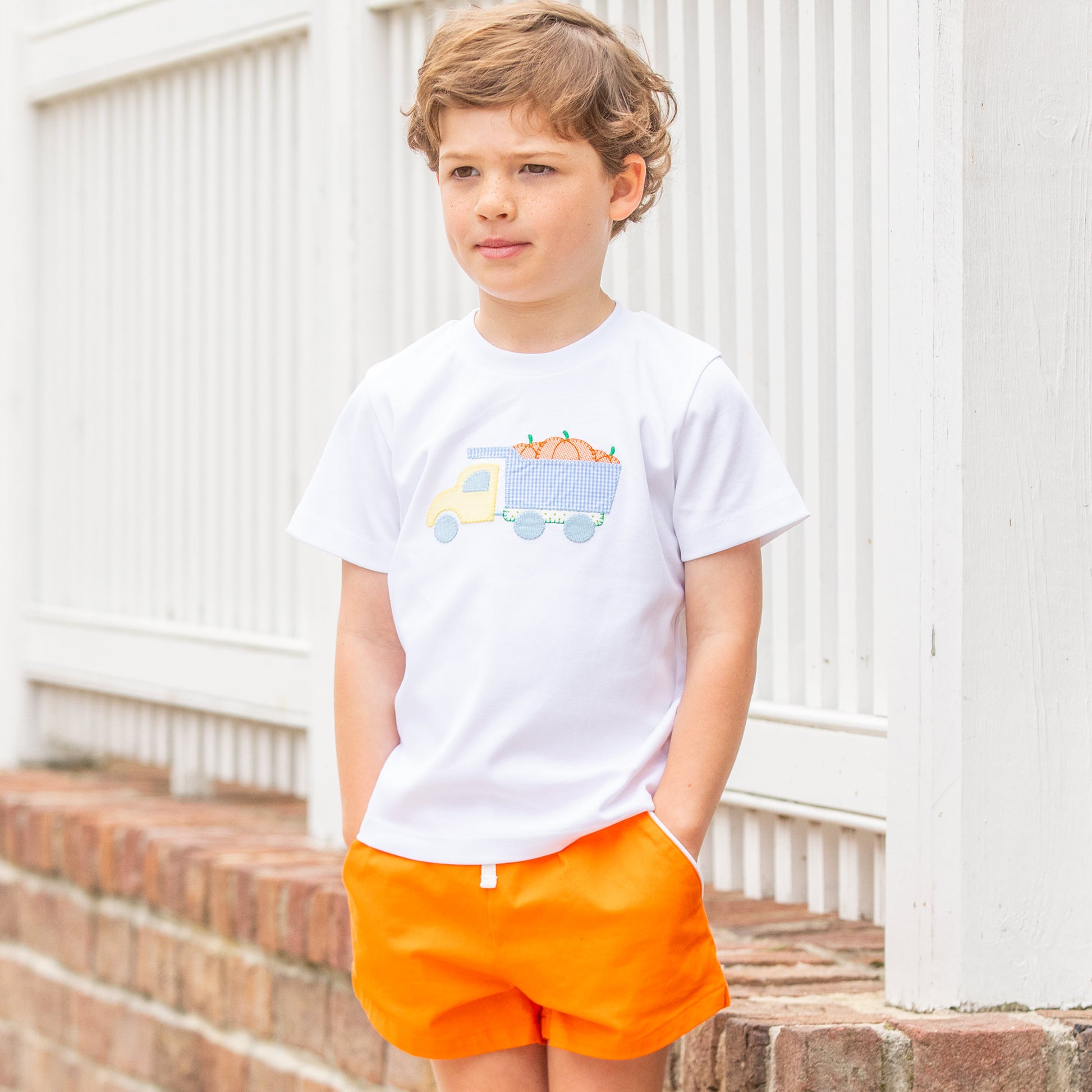 Featuring a soft cotton bright orange knit, white piping trimmed side pockets, a back pocket with a palmetto tree and shrimp logo, and a lined elastic waist with white drawstring, makes them the perfect shorts for pairing with our polos or graphic tees, especially our Boys Jack-O-Lantern Shirt-Blue Stripe for that upcoming hayride!