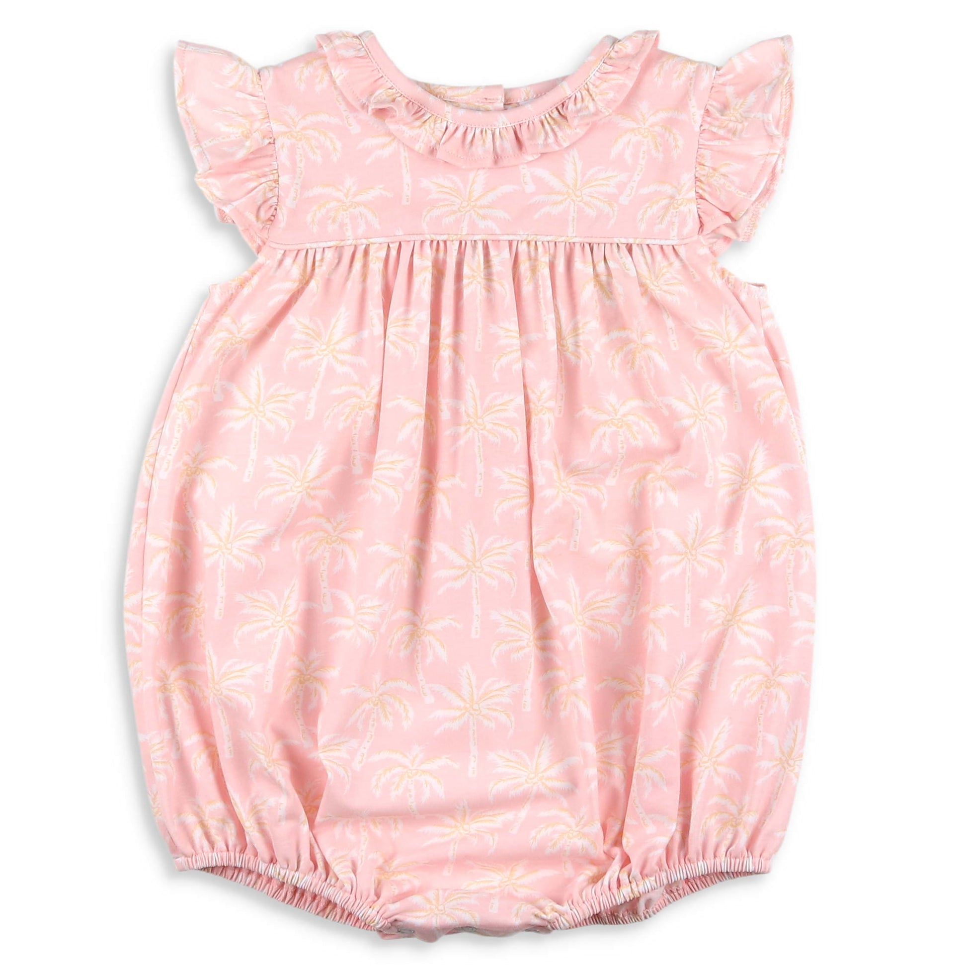 This sweet, vintage style, baby girls bubble and toddler girls bubble, features a white palm tree print on pink, cotton fabric with a ruffle collar, angel ruffle sleeves, and a piping trimmed bodice all making this outfit as fun as it is cute!
