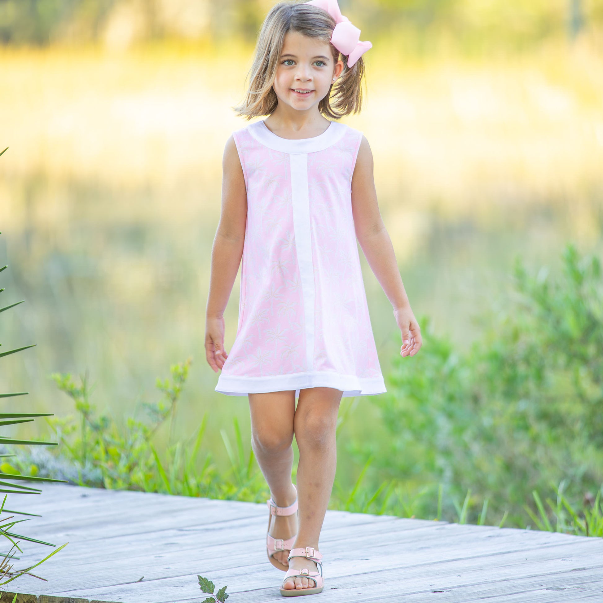 This sweet, vintage style, girls sleeveless dress and toddler girls dress, features a white palm tree print on pink, cotton fabric with wide white trim on the neckline, hem, and down the front,ย along with custom buttons at the back, making this girls summer dress as fun as it is cute!