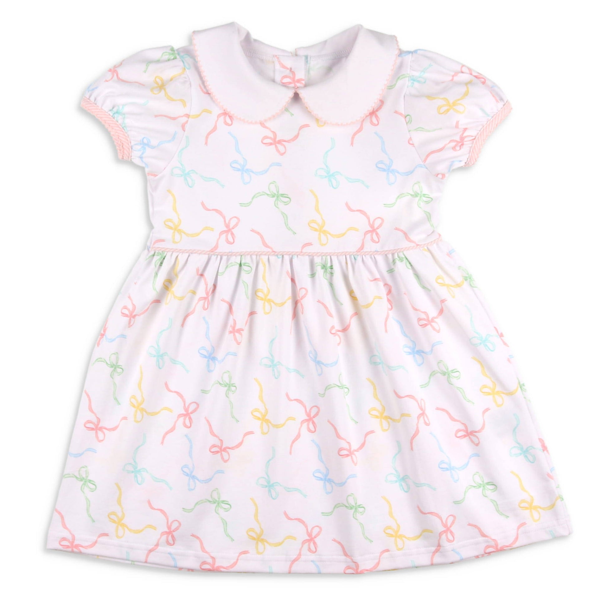 This easy to wear, vintage dress features a colorful print in blue, pink, yellow, and green bows, on white knit fabric with pink picot trim around the white collar and the short puffy sleeves, all helping to showcase this spunky, but classic look!