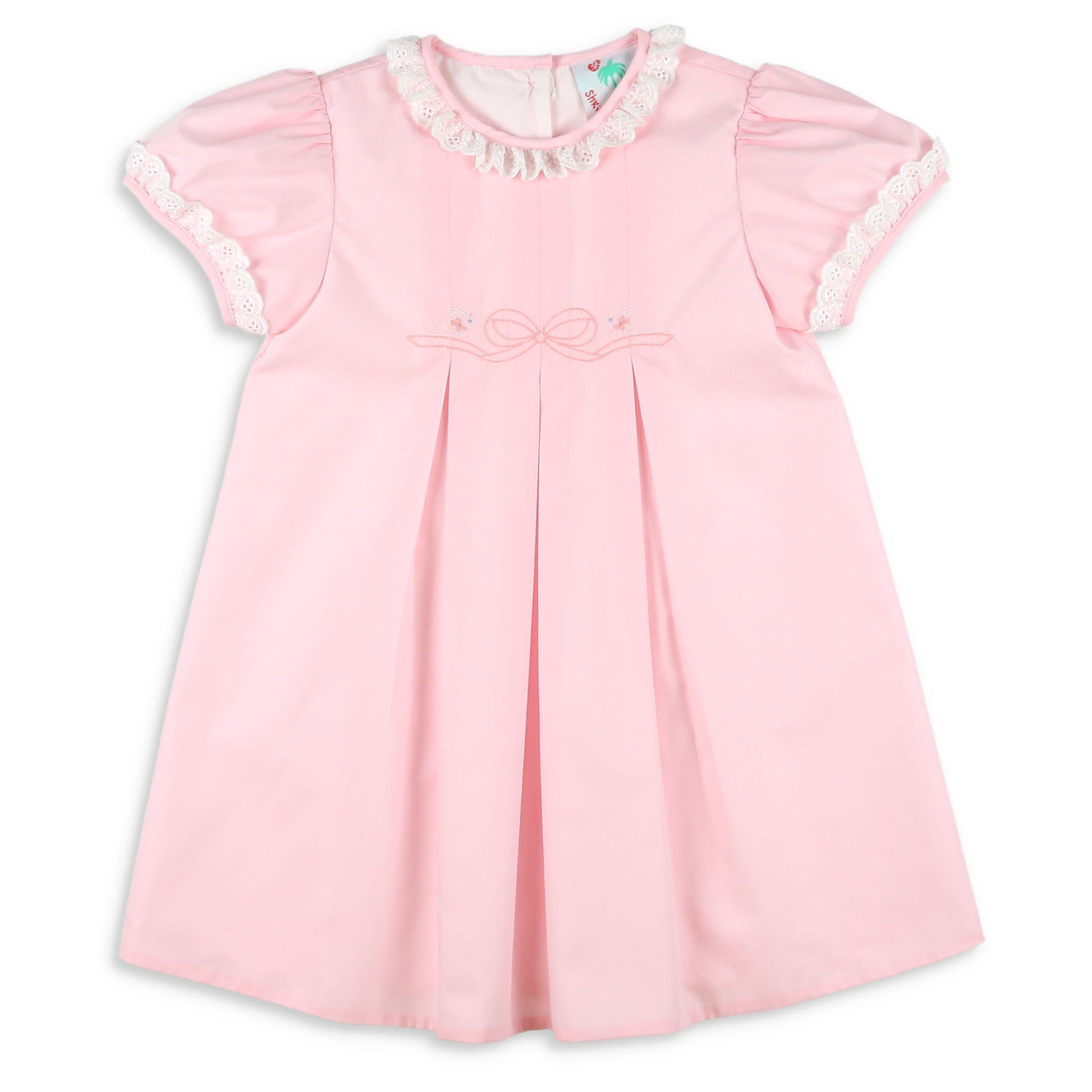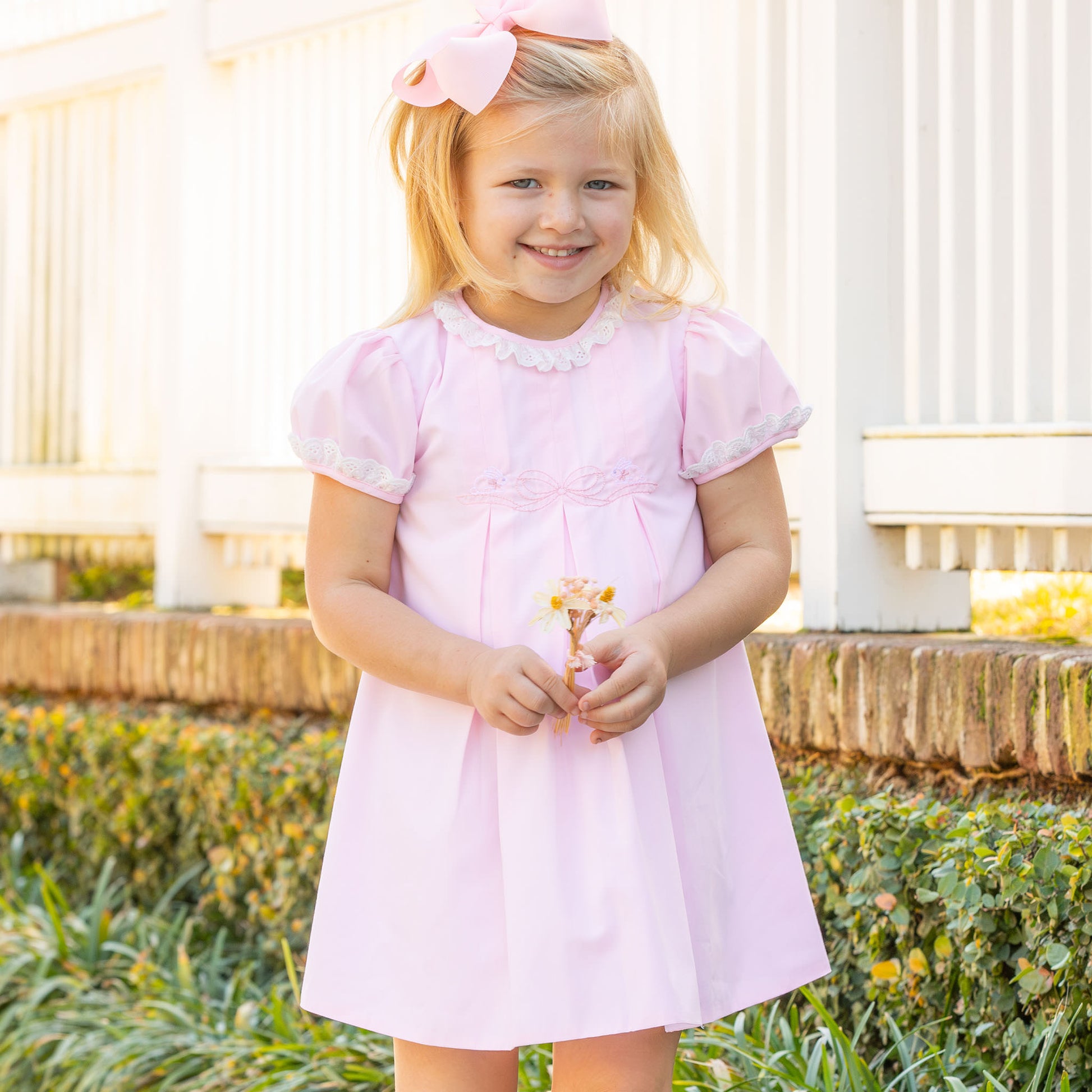This adorable lined dress features a pale pink soft poplin fabric with sweet white eyelet lace trimmed puffed sleeves, a pleated front, and an eyelet lace ruffle collar. The line embroidered bow, flanked by bunnies, above the front pleats just makes this comfy dress even more special!