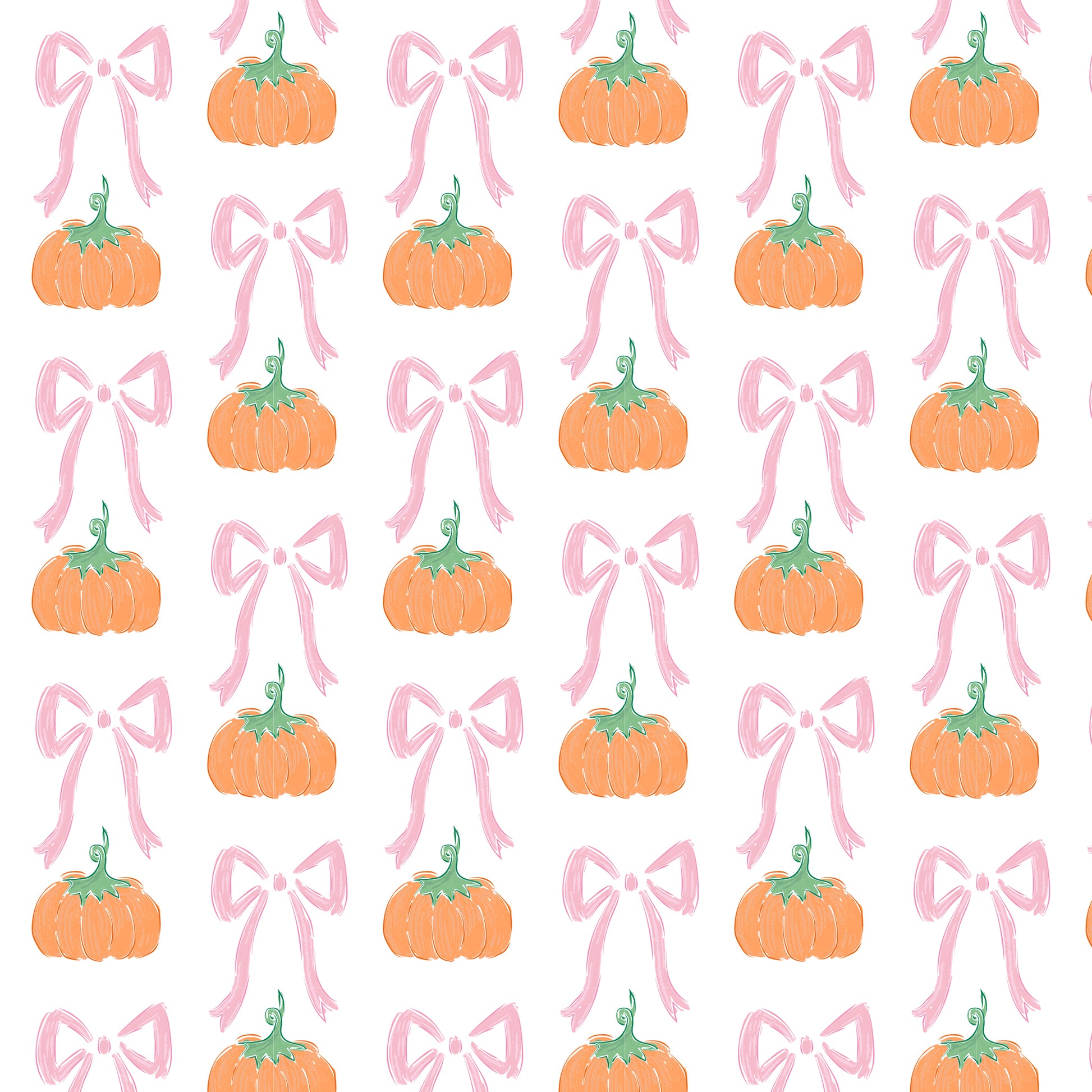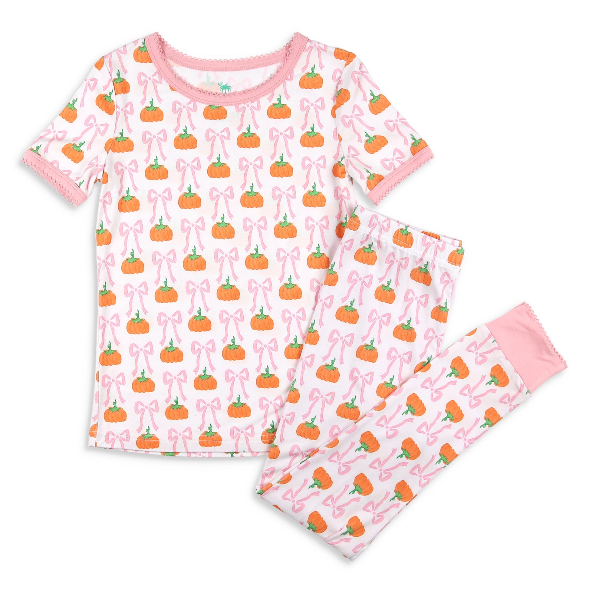 These sweet pajamas, feature an orange pumpkin and pink bow print on soft bamboo fabric, pink picot finished trim around neckline and on the short sleeves, and picot trimmed pink cuffs on the long pants, giving these pajamas a fun retro feel.