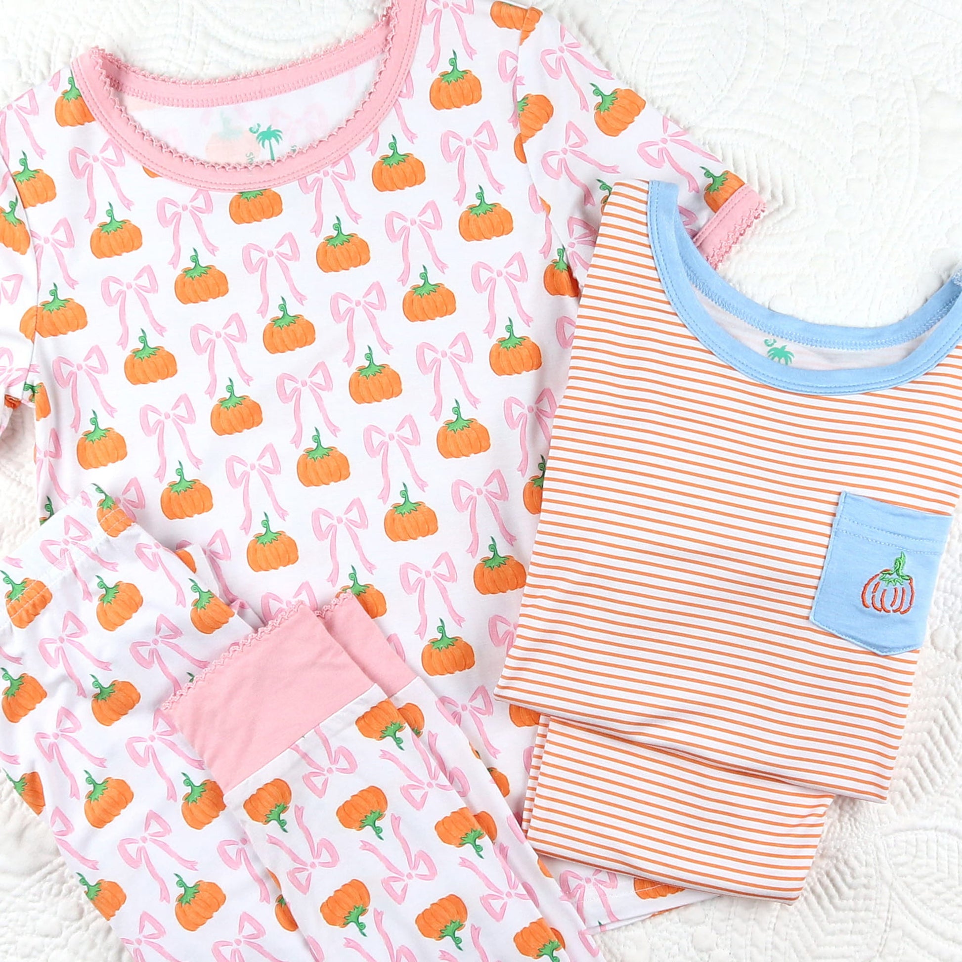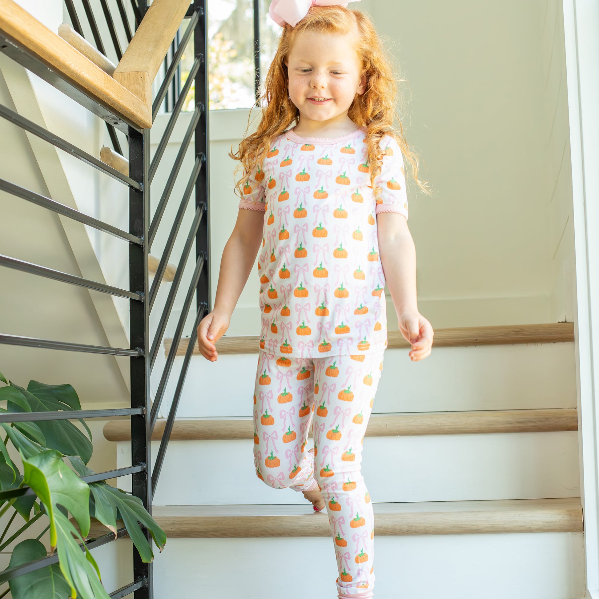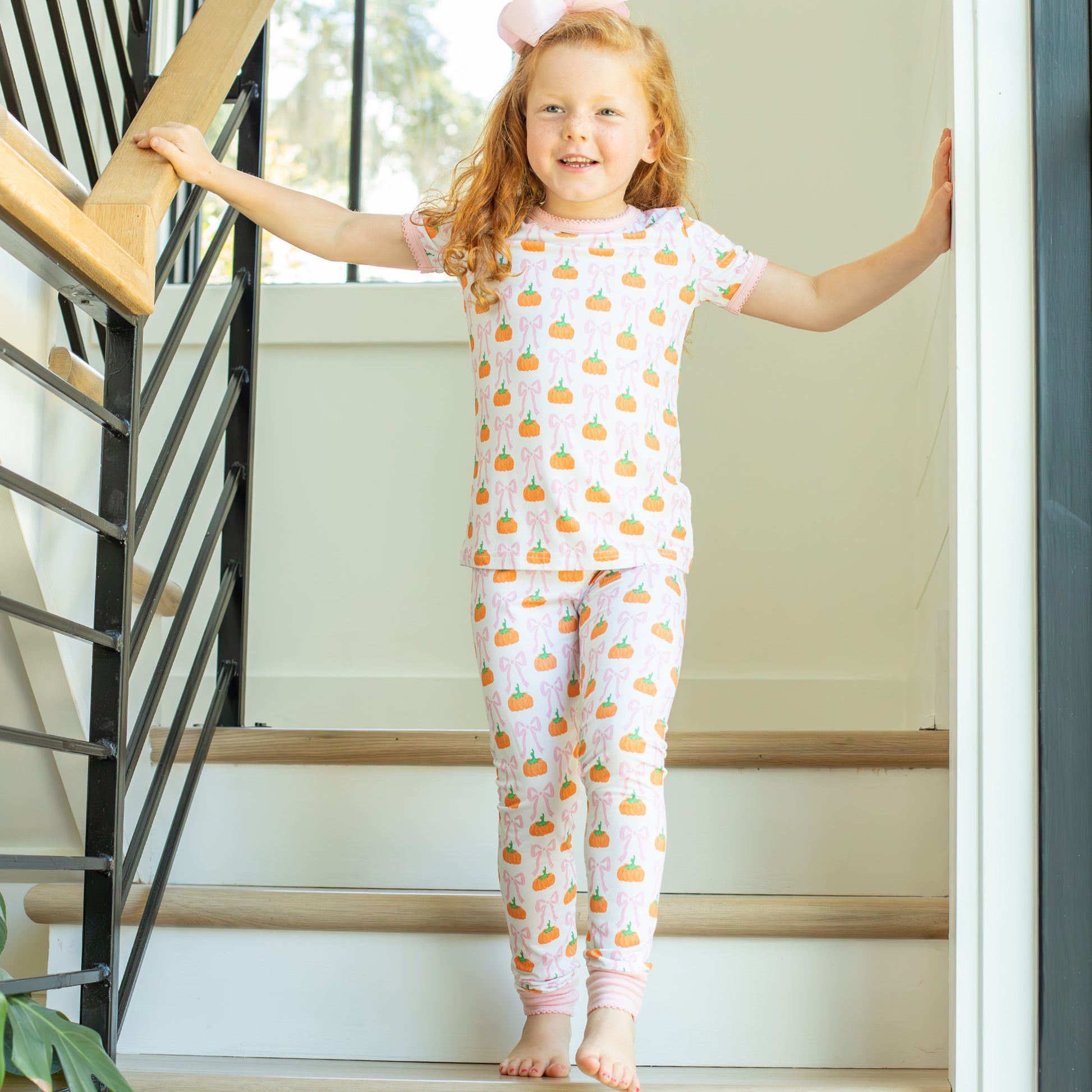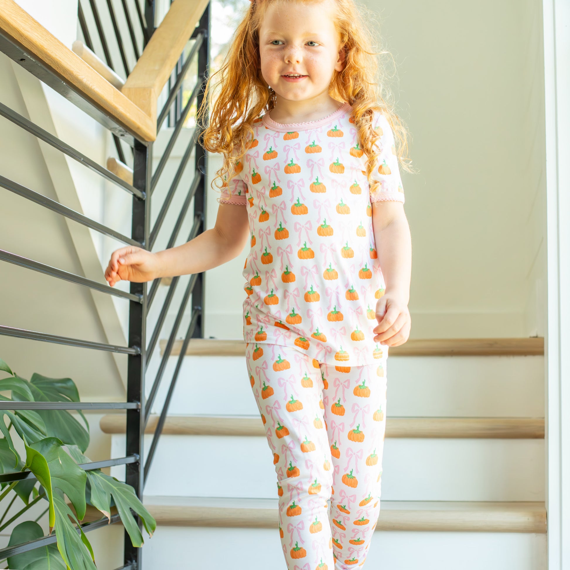 Nothing spooky here! She will be ready to dream about Halloween and enjoy the autumn nights in this whimsical Girls Bamboo Loungewear - Pumpkins by Shrimp and Grits Kids!