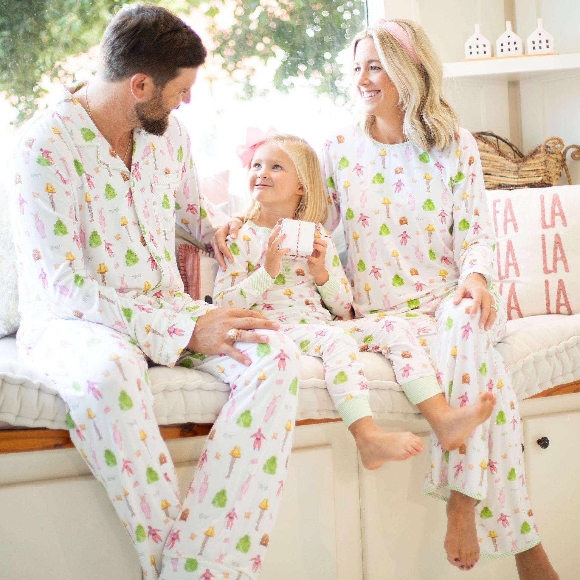This set features a watercolor print, hand drawn by our guest designer, Ella Hewitt, the daughter of the owner of Shrimp and Grits Kids, showcasing the bunny suit, bars of soap, Christmas trees, the snow suit, and of course the infamous leg lamp, on a white bamboo blend with a soft, flannel-like feel, and green and white striped piping trim along the collar, down the front, and on the pocket and cuffs, all making these pjs the biggest hit ever!!
