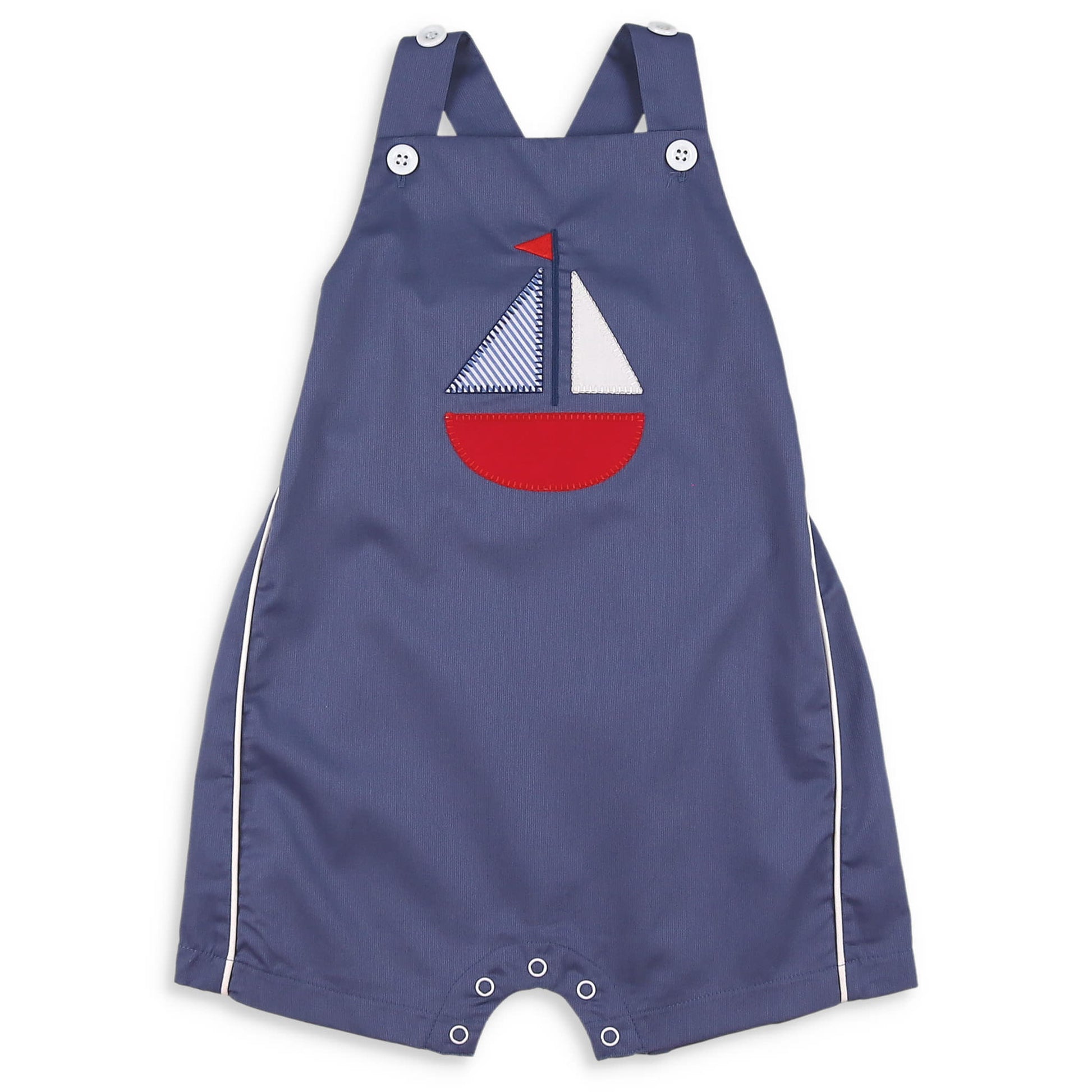 This classic appliqued baby boys bubble romper features a navy blue poly/cotton fabric trimmed in white piping with custom white buttons and an appliqued red, white, and blue sailboat at the front.