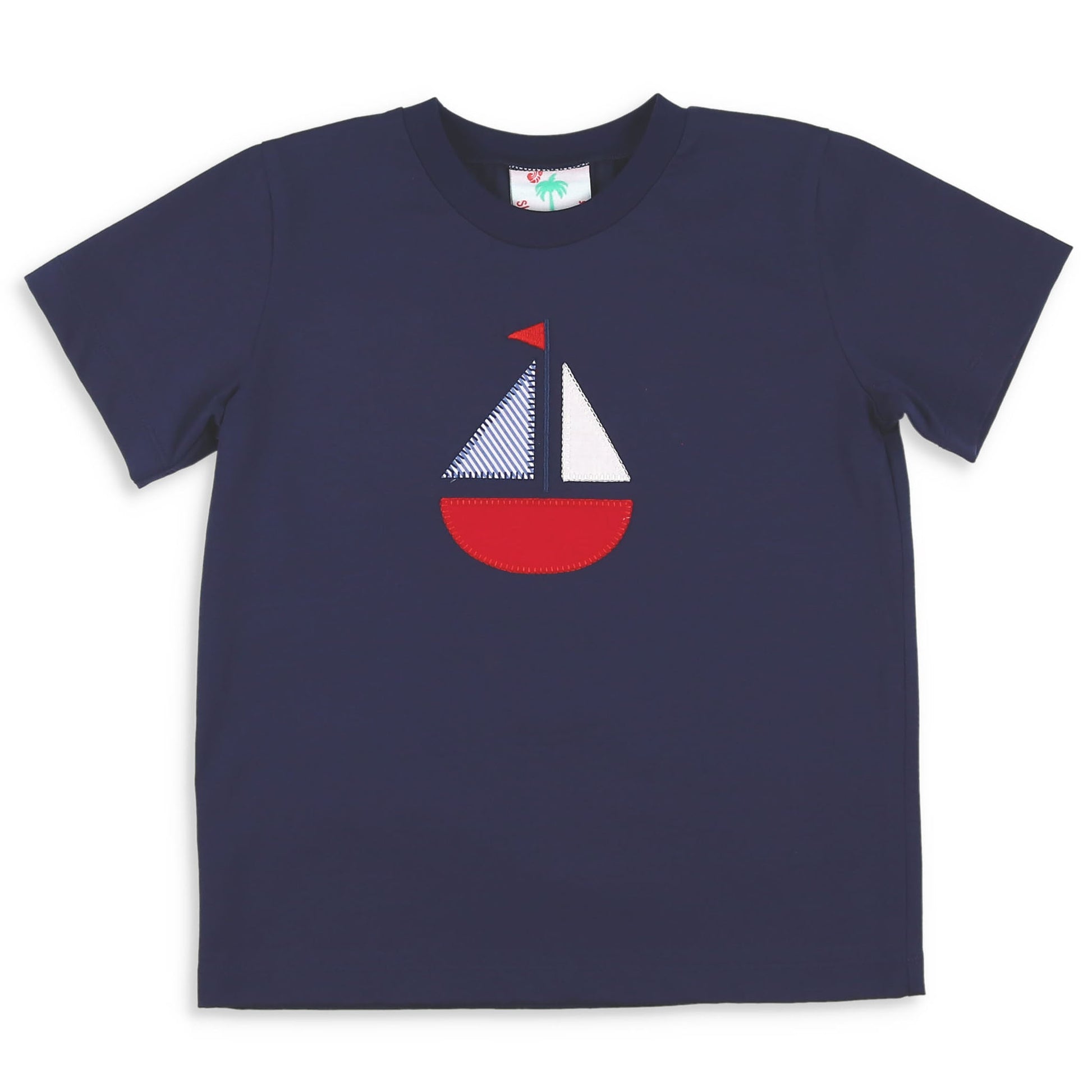 This classic boys tee shirt, baby shirt, or toddler tee shirt, features a navy blue cotton fabric, short sleeves, and an appliqued red, white, and blue sailboat at the front. Pair with our Red Shrimp Shorts for a look!
