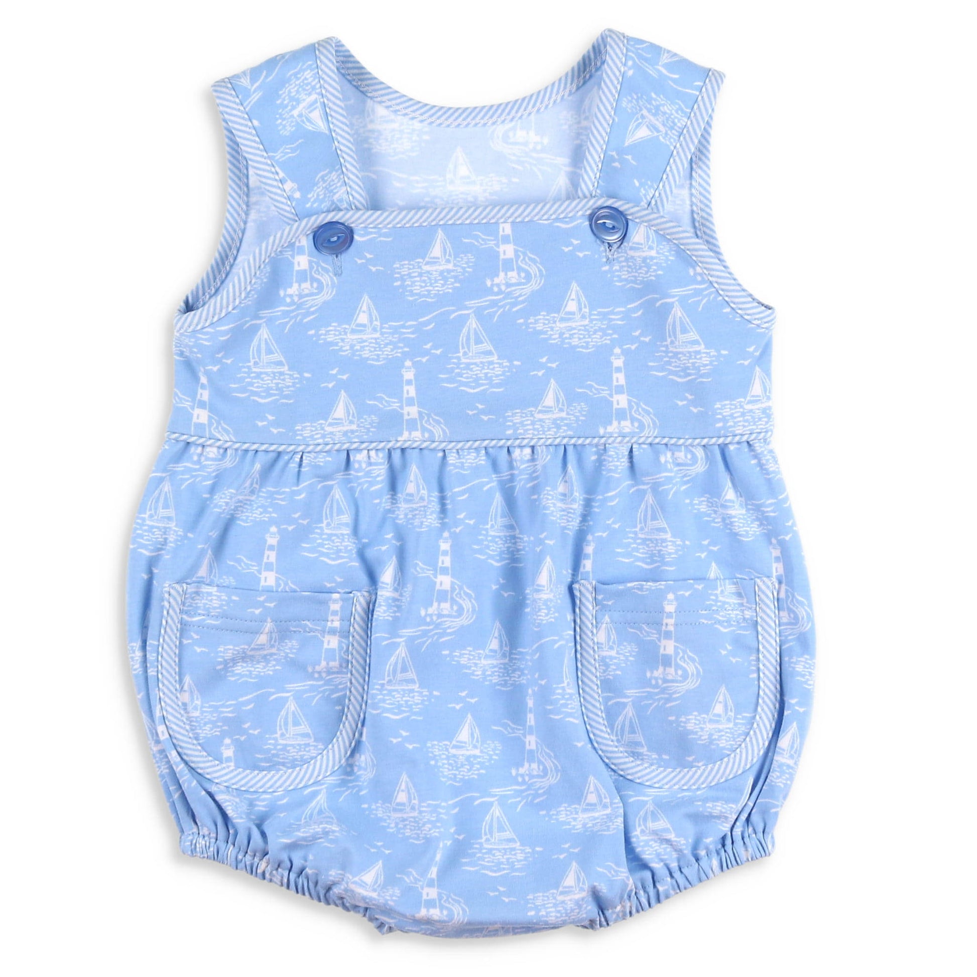 This handsome, vintage style bubble is made of the softest cotton knit that your little guy will love. Featuring a nautical white sailboat print on light blue fabric, diagonal stripe trim around the straps and two front pockets, diagonal stripe pipping across the front, and custom buttons, make this romper simply comfy and sweet.