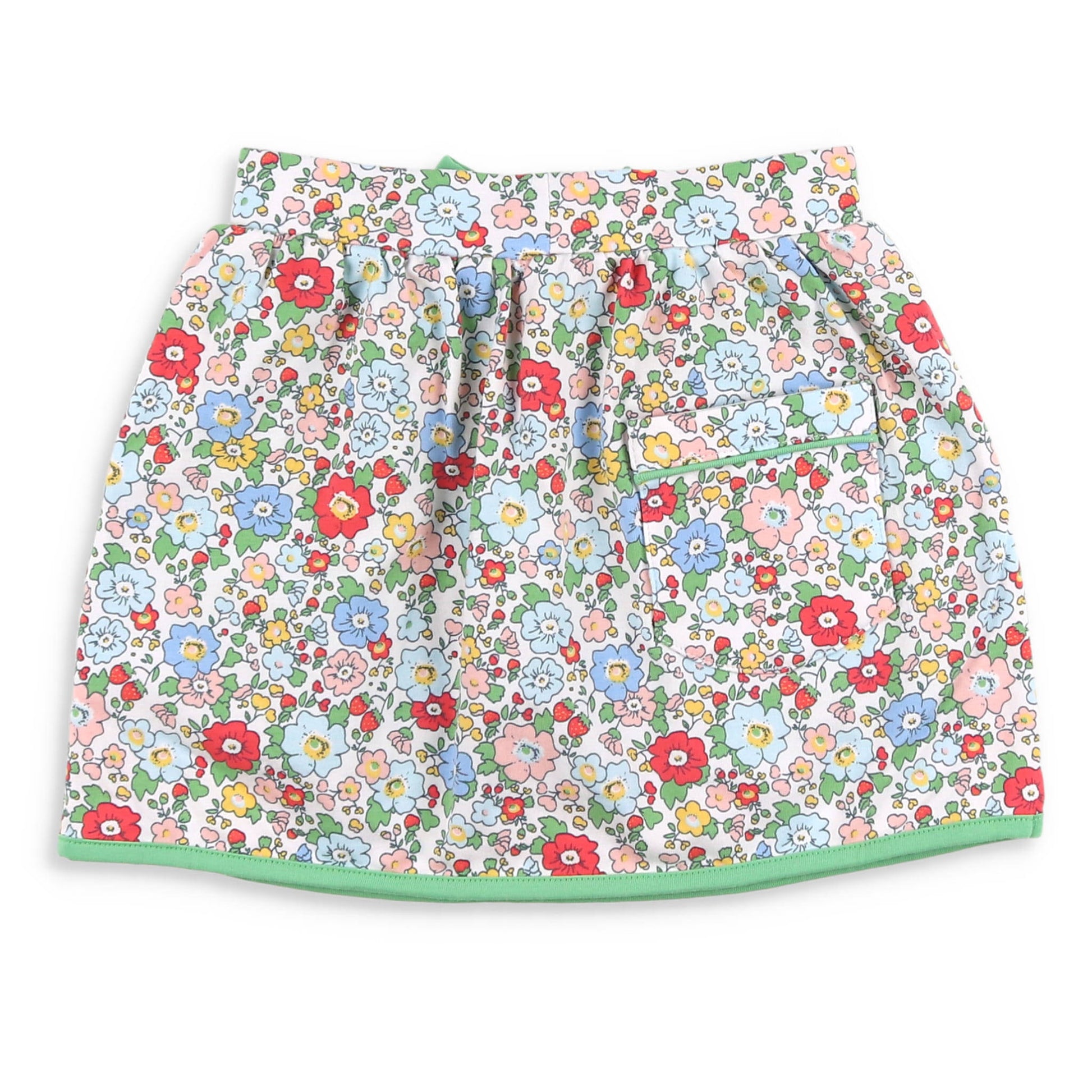 This comfortable skort features a floral print of blue, pink, and coral flowers along with greenery, on white knit fabric with green trim along the side pockets and finishing the bottom hem, a green drawstring at the waist, and under skort pants for that added comfort.