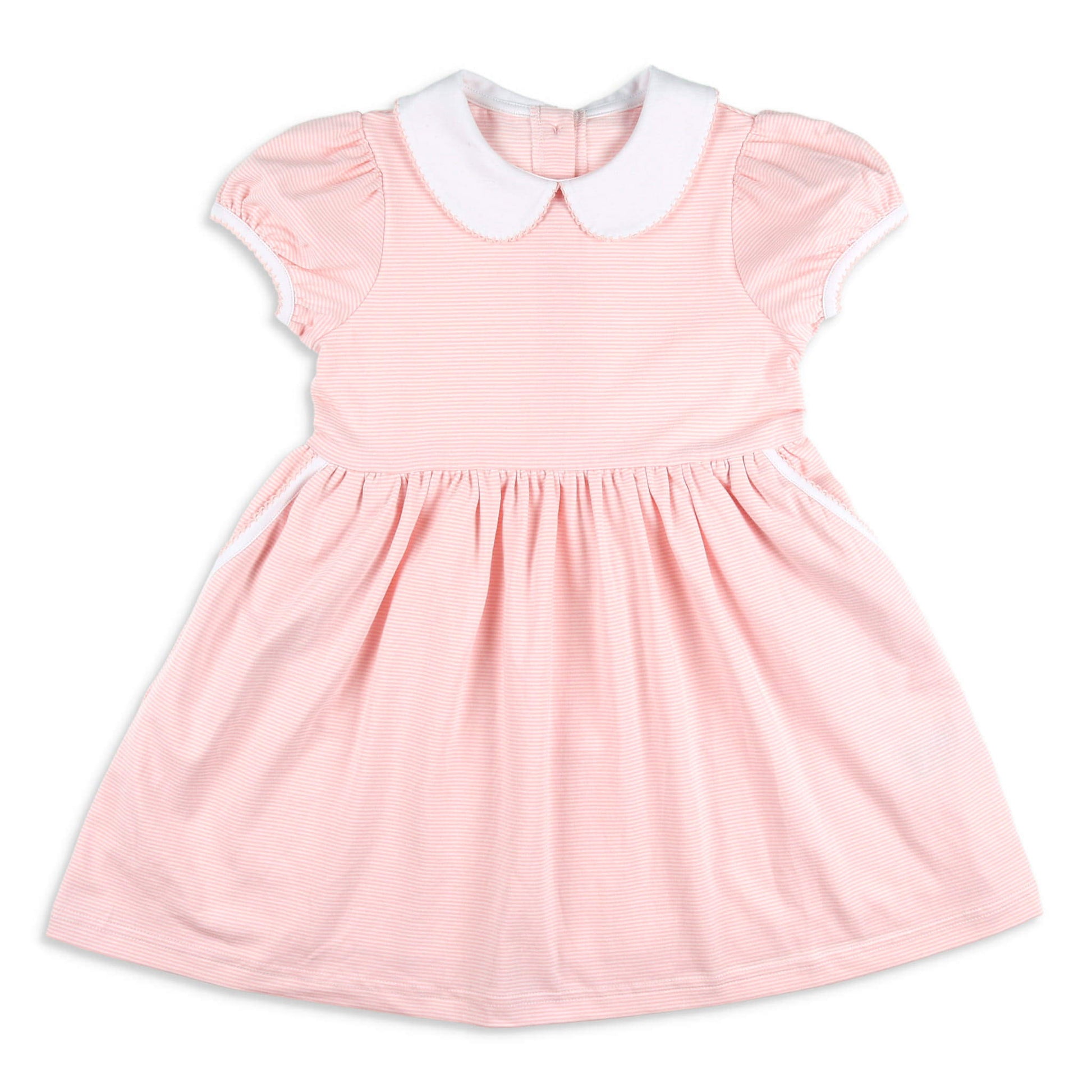 This adorable, vintage style outfit is made of the softest cotton knit that your daughter will love. Featuring a feminine pink stripe fabric, a pink picot trimmed white collar, picot finished white trim on the short sleeves, white trimmed side pockets, and custom buttons down the back, make this dress simple and sophisticated.