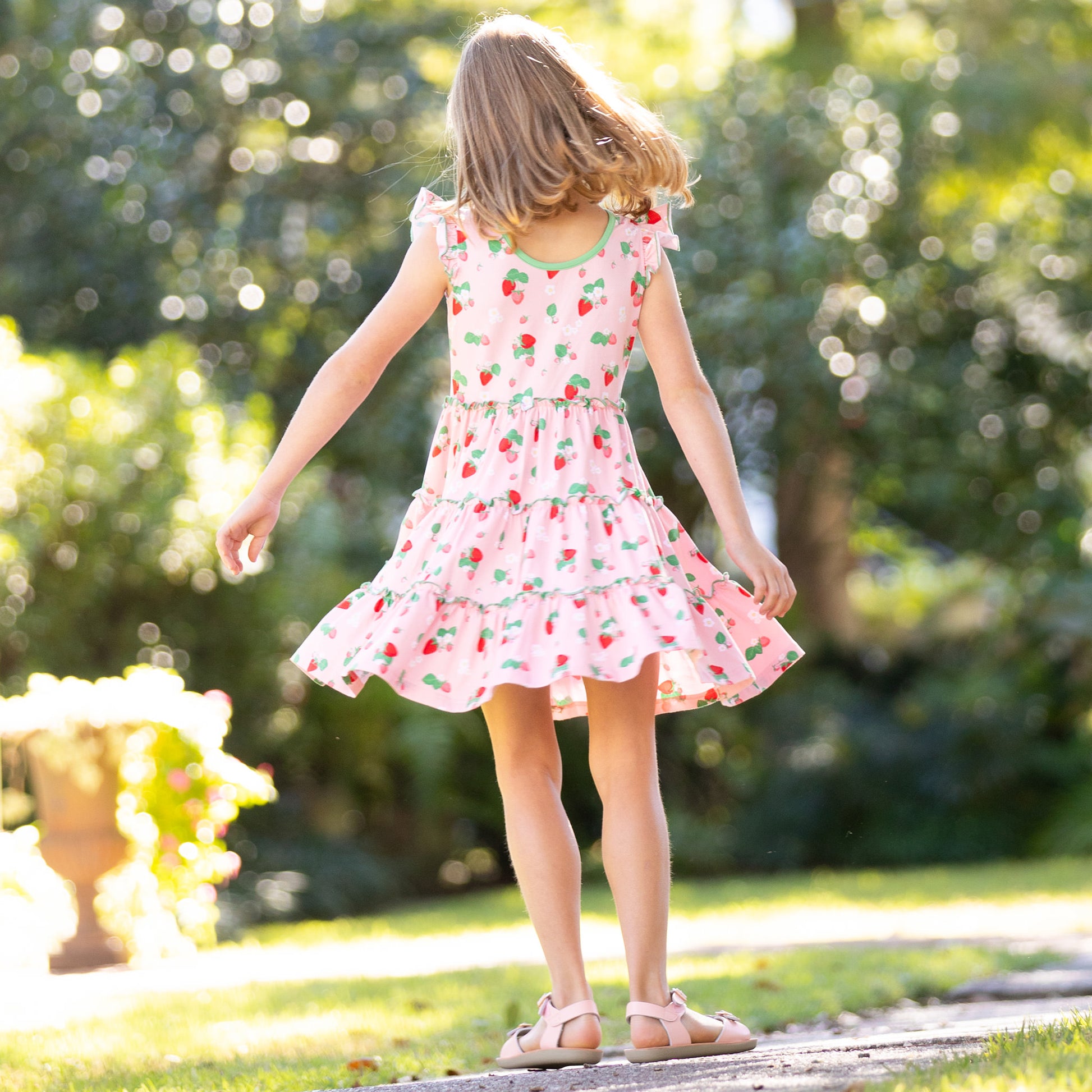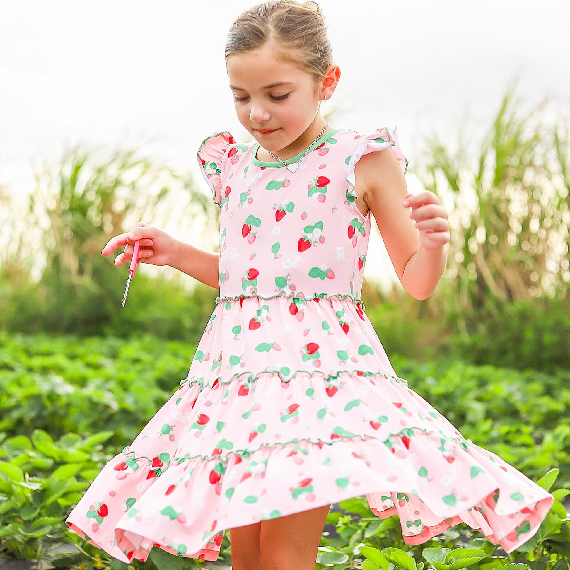This whimsical dress features a delicate strawberry and strawberry blossom print on a soft pink cotton blend fabric, green trim around the neckline, green serge trim ruffle sleeves, ruffles at the waist and two on the skirt, and of course it has the twirl skirt that girls love!