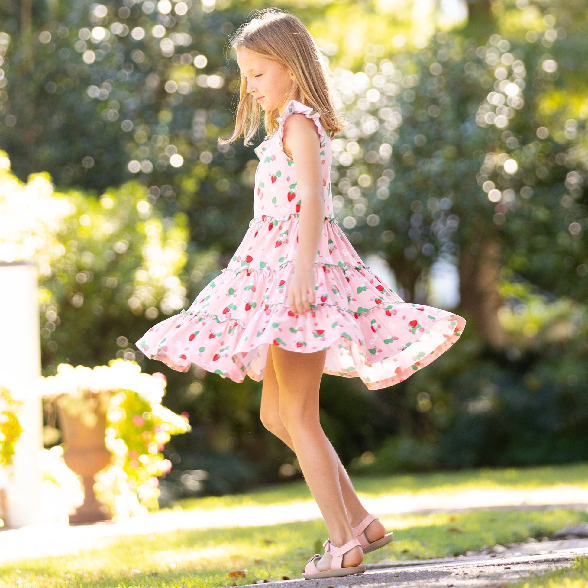 Grab your baskets and head to the fields. The berries will be ripe for picking in this juicy and sweet Strawberry Shortcake Twirl Dress by Serendipity.