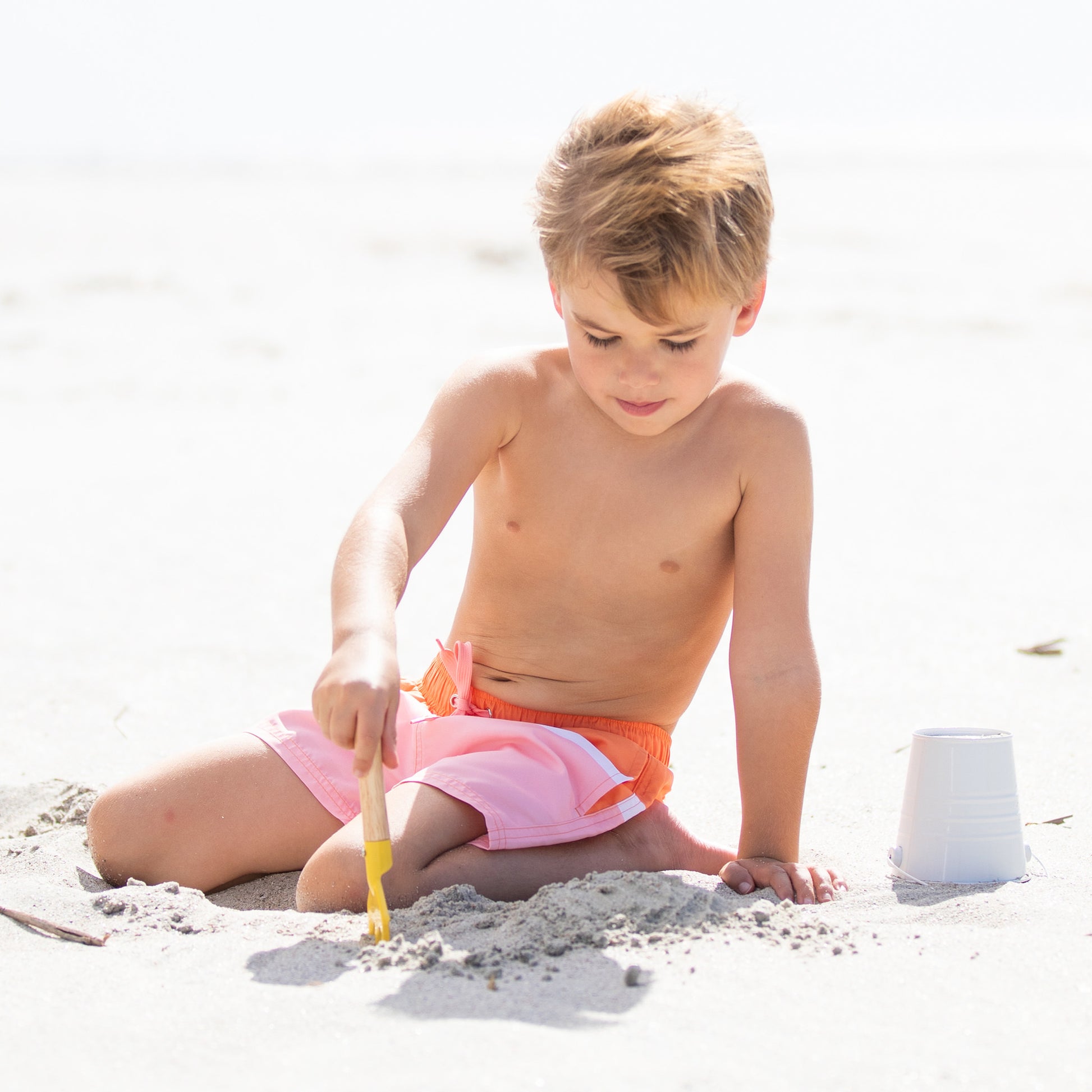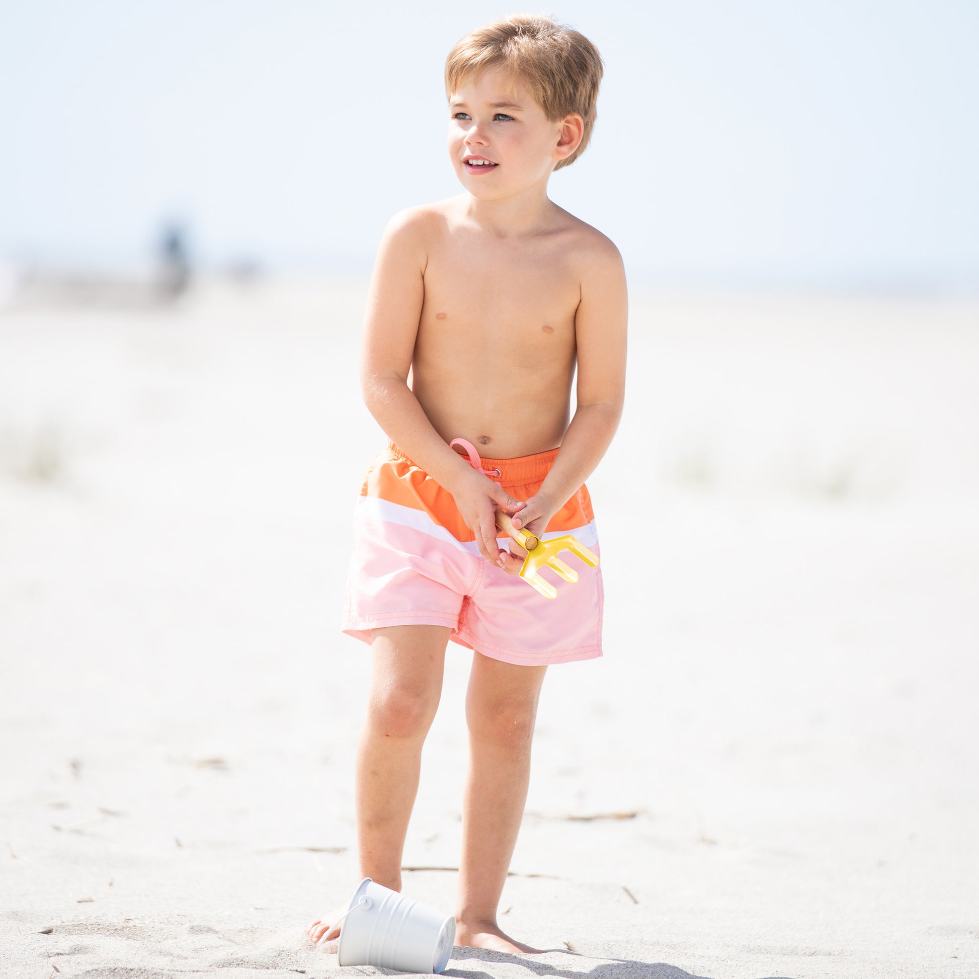 Feel the sunshine in this bright and awesome, boy's bathing suit. Grab the sunscreen and sunglasses! On water or on land, he'll be ready for the beach in our Sunny Colorblock Boardies by Mullet Swim.