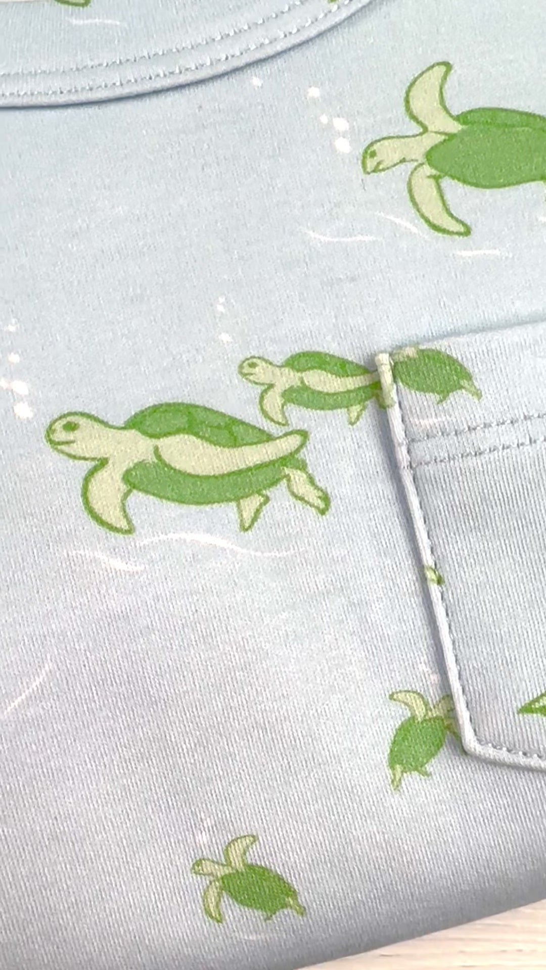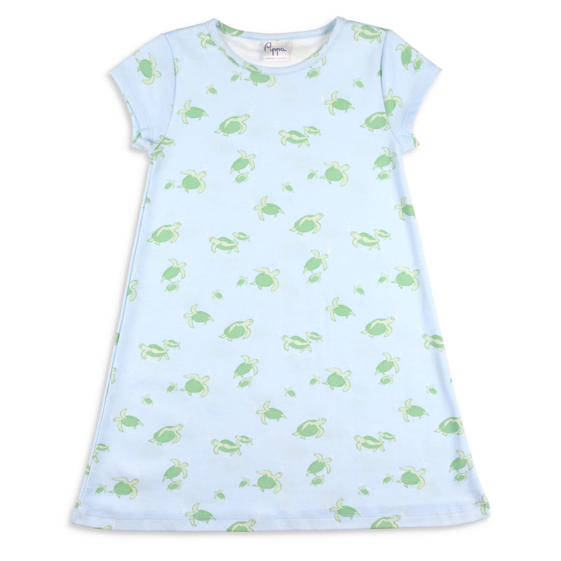 Featuring happy, swimming green sea turtles on light blue, super soft pima cotton, with a banded neckline and sleeves trimmed in the same fabric. Your girls will surely be comfy in these sleek and simple lines and ready for any adventure!Â