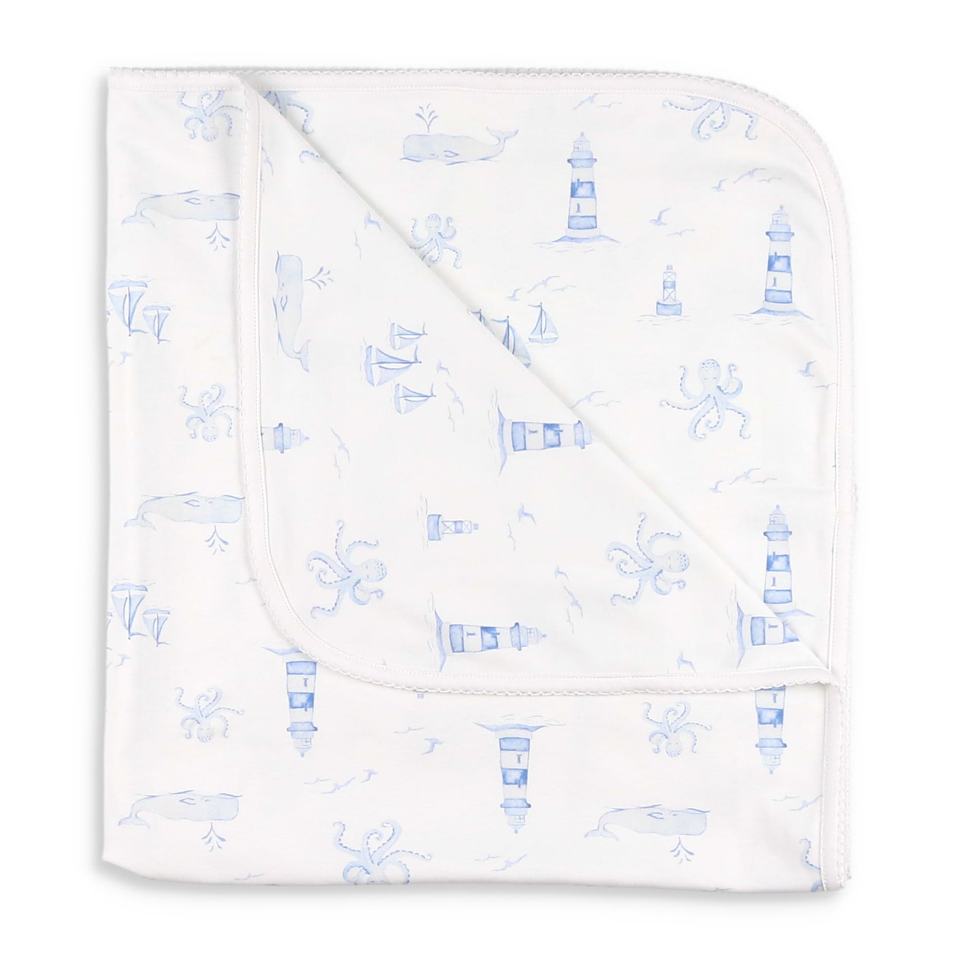 Our new gender neutral, Nautical Toile Pima Blanket from Pippa, features a soft nautical blue light house and sea creature toile print on super soft white Pima cotton on the front and back, and is finished with white picot and white trim. This sweet blankie will keep the baby comfy all day or night long, especially for swaddling at the beach!