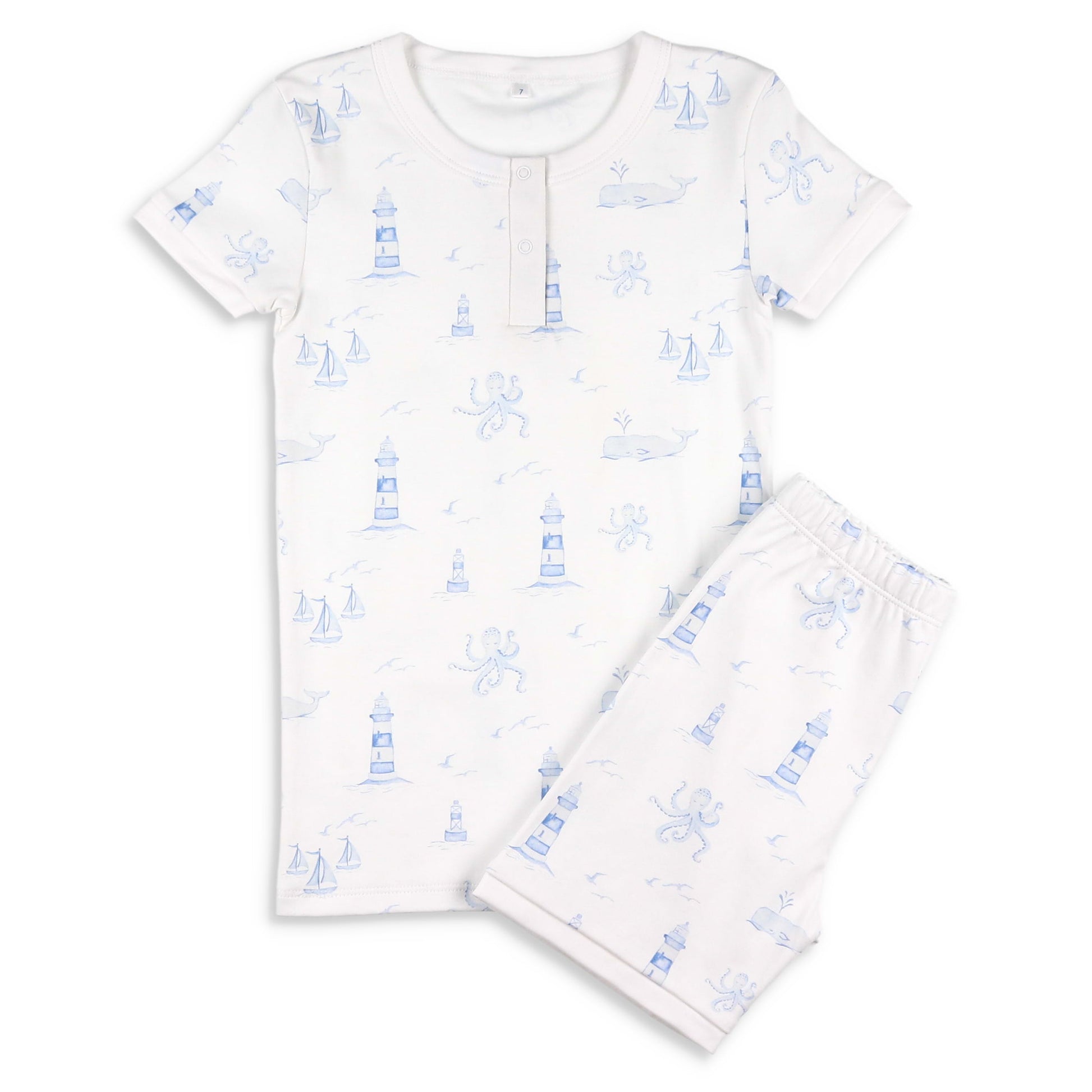 These timeless and comfy, kids and toddler gender neutral pjs, feature a nautical blue light house and sea creature toile print on soft white Pima cotton, with a solid white trim around the neckline, the snap placket, trimming the short sleeves, and trimming the hem of the short bottoms.