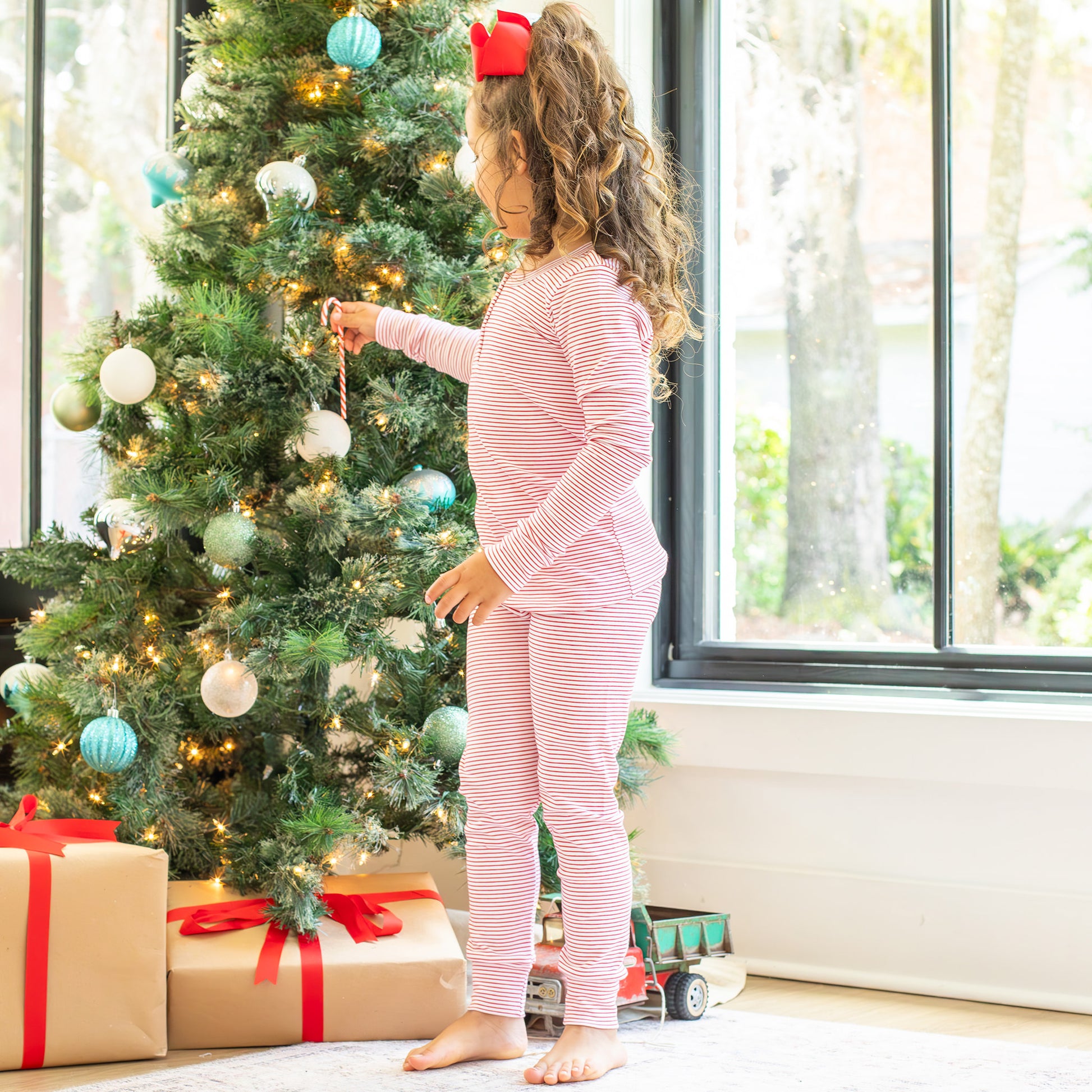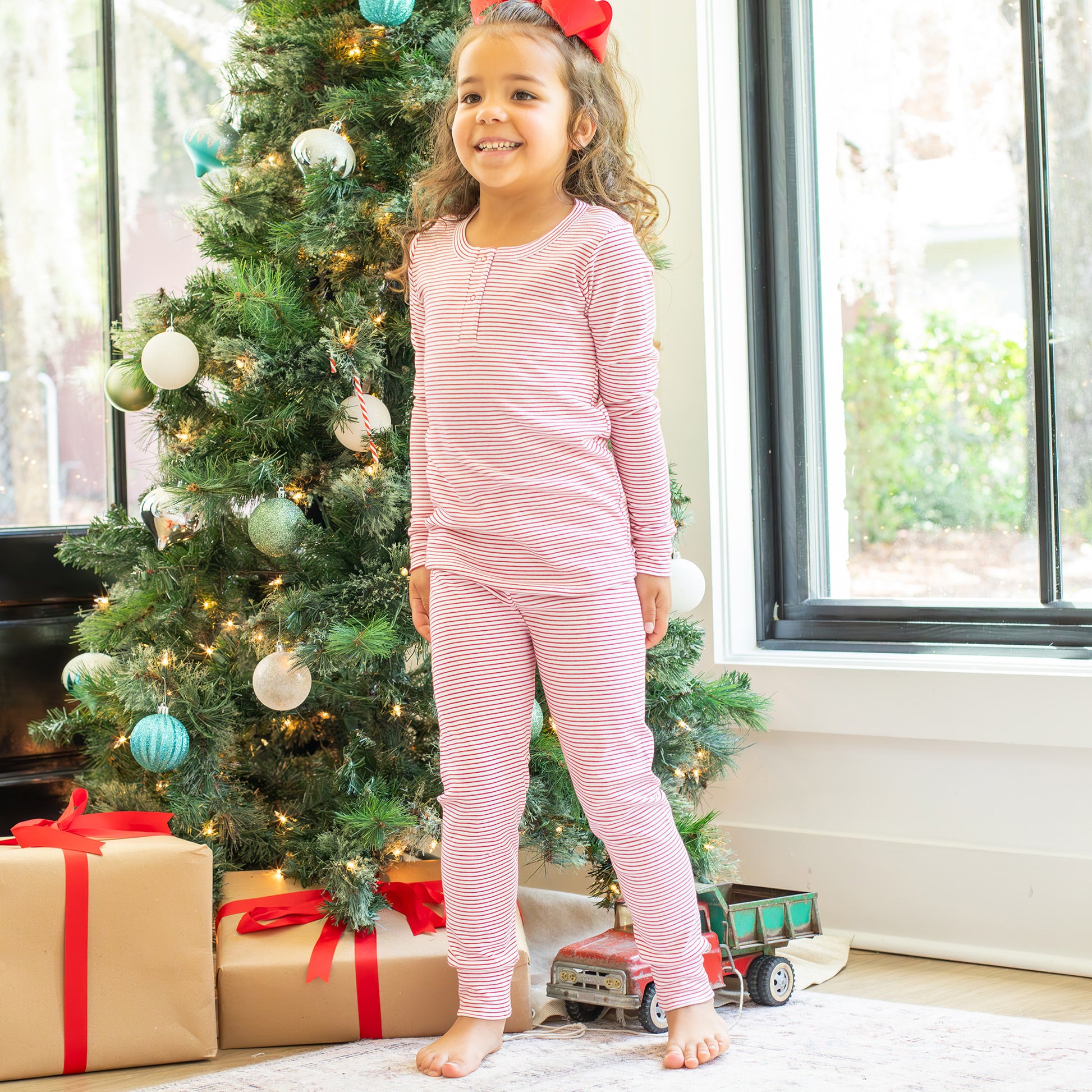 These timeless and comfy, gender neutral, holiday pjs feature the softest and most joyful red and white striped pima cotton, with a banded red and white stripe neckline, a striped snap placket, and striped sleeve and leg cuffs.