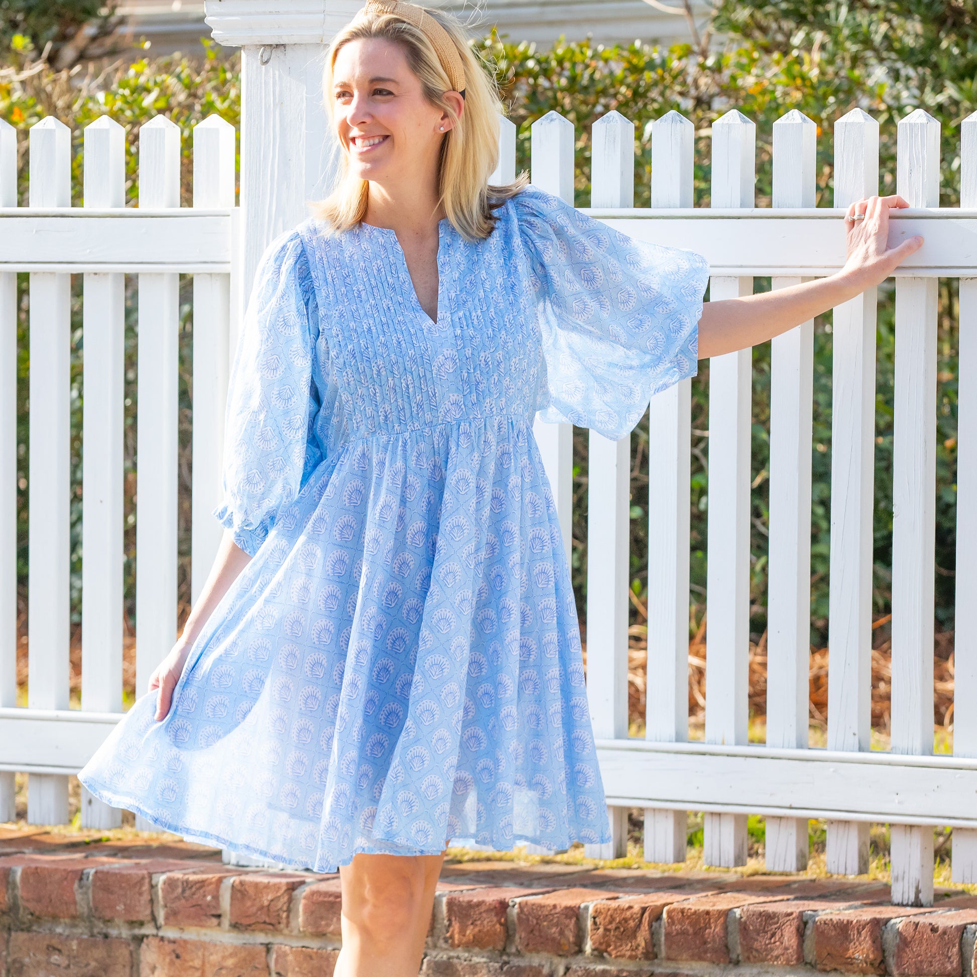 This comfortable and effortless bohemian inspired dress features 3/4 balloon style sleeves, pintuck pleats at the bodice, and a full skirt on a Jaipur inspired hand printed block print crafted in India, of white seashells on soft beach blue cotton fabric. So carefree and comfy!